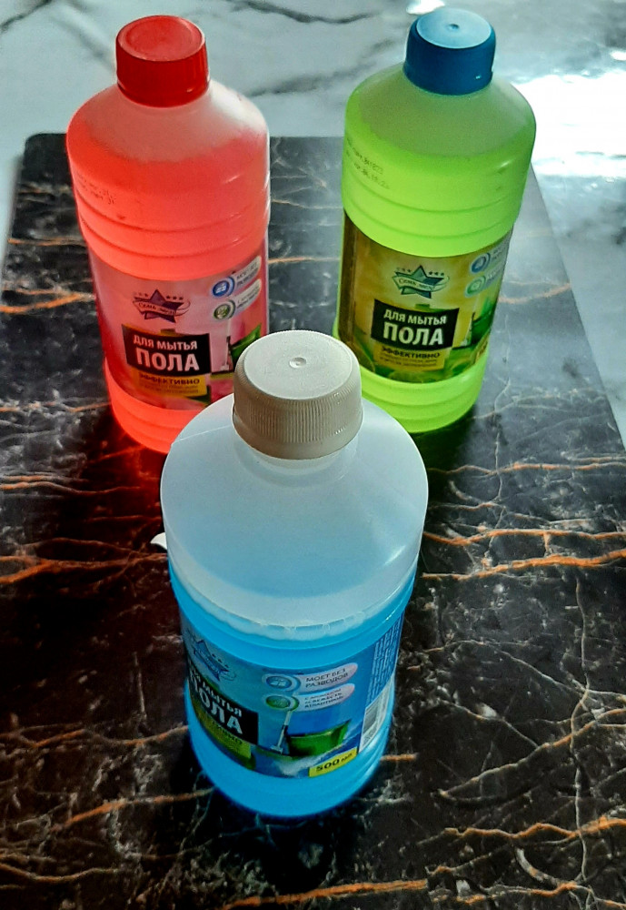 Купила на пробу эти средства разных цветов. И такое ощущение, что это средство изготовлено Кустарно-Подпольным образом. Крышка при вскрытии, НЕ отделилась от Защитного кольца, а Прокрутилось и Открылось вместе с крышкой. Такого Не должно быть. А должен быть Щелчок и защитное колечно должно оставаться на горлышке бутылки. Прилагаю фото бутылок и Крышек, с Неотделёнными защитными колечками. Значит любой может открыть и налить туда подкрашенную воду. Вообщем, абсолютно бесполезное средство для мытья полов.
