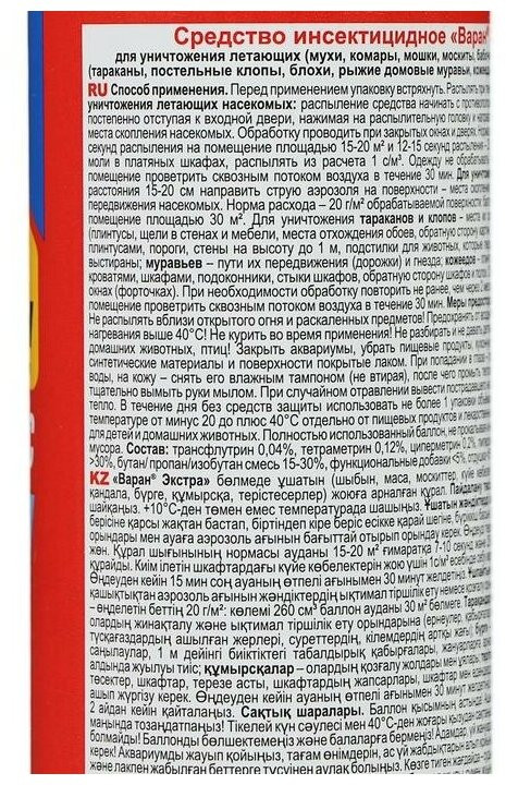 Средство рекомендуется использовать в помещениях, избегая попадания насекомых на глаза, кожу и одежду. После обработки помещение необходимо проветрить. Средство «Варан» Экстра является эффективным и доступным средством борьбы с летающими насекомыми в доме, квартире или на даче.