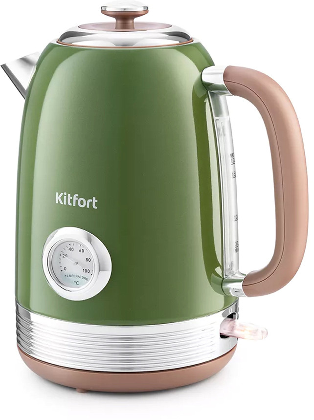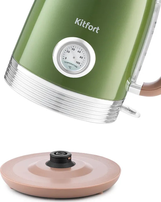 Чайник Kitfort КТ-6110 имеет встроенный термометр, выполненный в винтажном стиле. Это очень удобно для заваривания различных напитков, для которых требуется определённая температура воды. Например, зелёный чай, белый чай, кофе и тд.