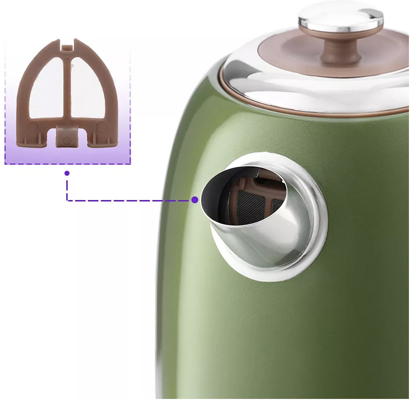 Специальная форма носика позволяет точно наливать воду в чашку без расплёскивания и брызг и быстро наполнять её. В носике чайника расположен съёмный фильтр от накипи, который задерживает частички накипи и предотвращает их попадание в чашку.