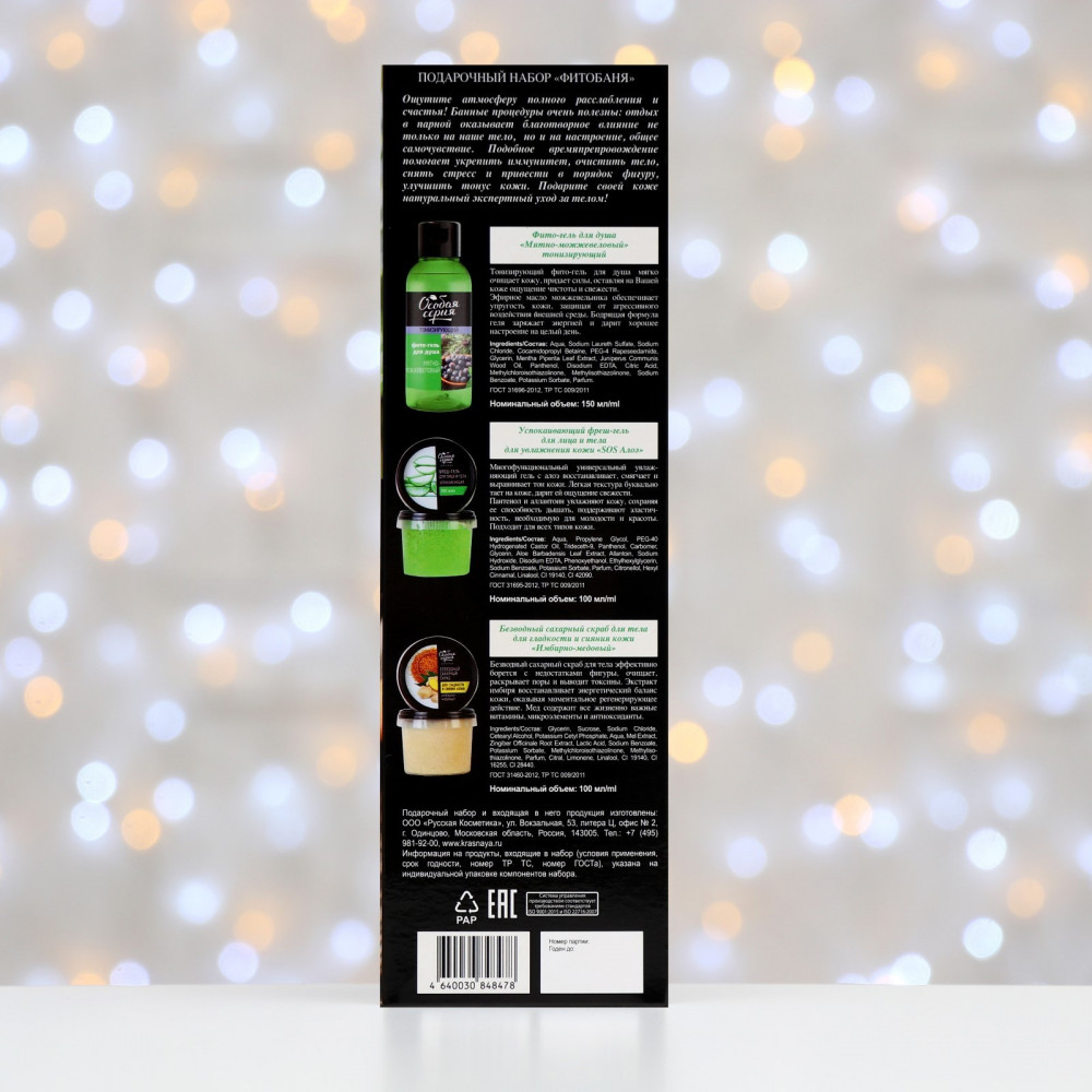 Фито-гель для душа тонизирующий: Aqua, Sodium Laureth Sulfate, Sodium Chloride, Cocamidopropyl Betaine, PEG-4 Rapeseedamide, Glycerin, Mentha Piperita Leaf Extract, Juniperus Communis Wood Oil, Panthenol, Disodium EDTA, Citric Acid, Methylchloroisothiazolinone, Methylisothiazolinone, Sodium Benzoate, Potassium Sorbate, Parfum.