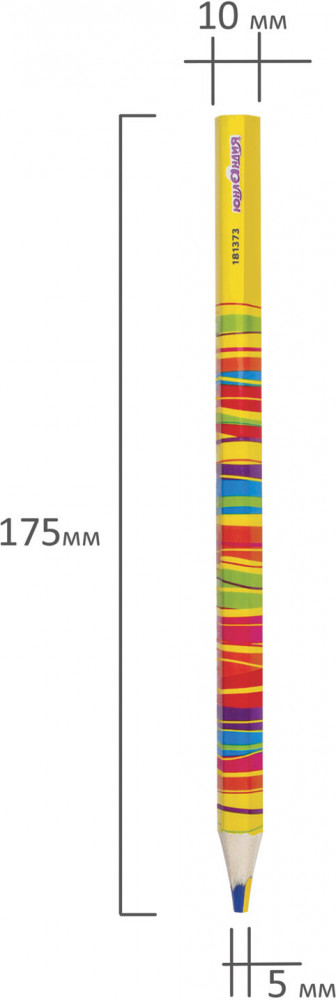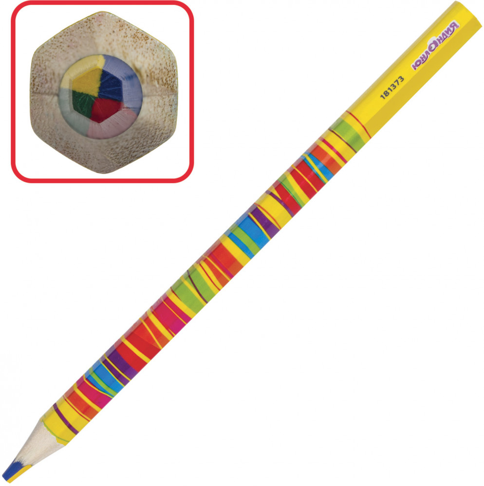 Необычный грифель карандаша сочетает в себе четыре цвета — желтый, зеленый, красный и синий. Утолщенный шестигранный корпус позволяет не скатываться карандашу с поверхности стола во время занятий рисованием и комфортно располагается в руке ребенка. Карандаш изготовлен из высокосортной белой древесины ценных пород. Корпус покрыт цветной печатью. Мягкий грифель из натуральных материалов и пигментов диаметром 5 мм обладает повышенной прочностью. Карандаш с многоцветным грифелем способствует развитию творческого мышления, мелкой моторики рук, цветового восприятия, фантазии и воображения ребенка.