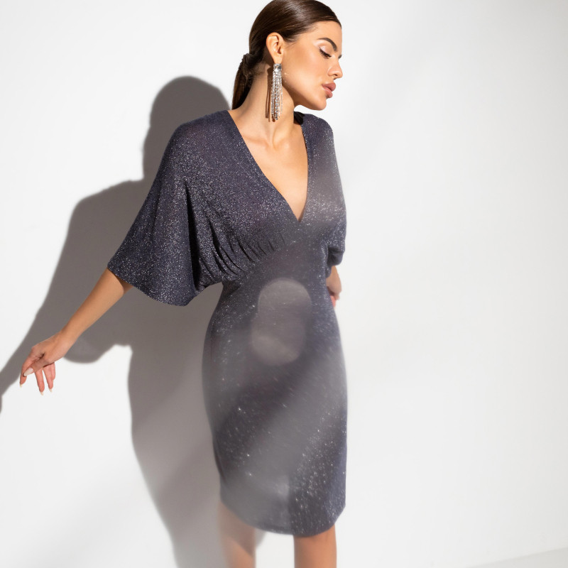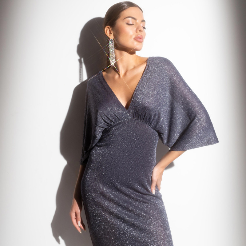 Блестящее синее платье от компании Charutti. Модель полуприлегающего силуэта, выполнена из трикотажного полотна с люрексом. V-образный вырез горловины по переду и спинке. Цельнокроеные рукава длинной ¾. Отрезное под грудь. Идеальный выбор для создания нарядного образа.