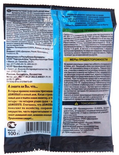💳 Оплатить за товар можно при получении 🇰🇿 Есть бесплатная доставка по Казахстану от 1 дня 🎁 Копите бонусы с каждой покупки Родентицидное средство в виде готовой к применению зерновой приманки (зерно или крупа) красного или розового цвета для уничтожения крыс (серых, черных, водяных) и мышей весом 100 г. Предназначено для уничтожения грызунов в жилых и нежилых помещениях, подвалах, погребах. Современное действующее вещество последнего поколения в сочетании с качественным зерном и пищевыми привлекателями обеспечивают высокую родентитцидную активность препаратов отношении грызунов. |