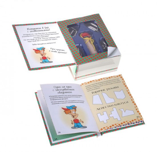 - Книга с играми, задачками, оптическими иллюзиями и решениями (мини-брошюра в твердом переплете с цветными иллюстрациями, 48 страниц)