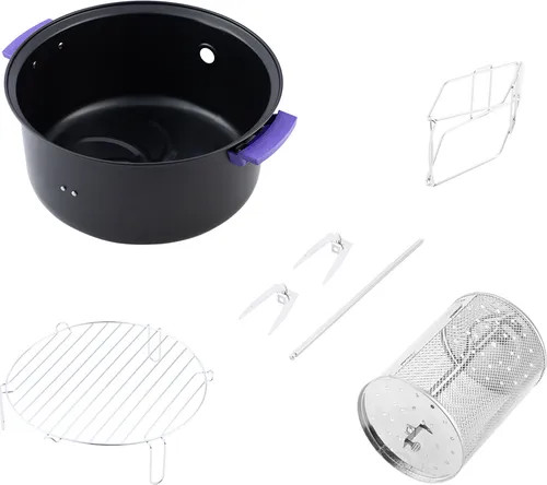 В комплекте к аэрогрилю идут вертел для приготовления курицы целиком, решётка, вращающаяся корзина. На решётке можно располагать продукты или термостойкие чаши и готовить в них. Вращающаяся корзина подходит для приготовления картошки-фри и других блюд.