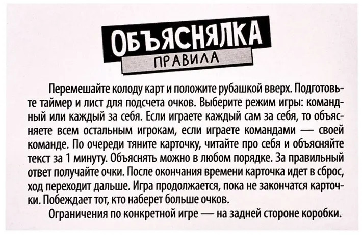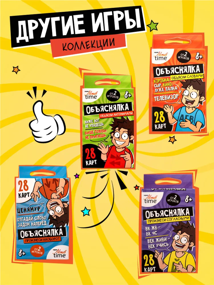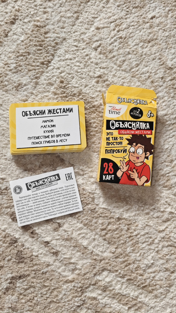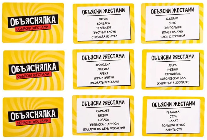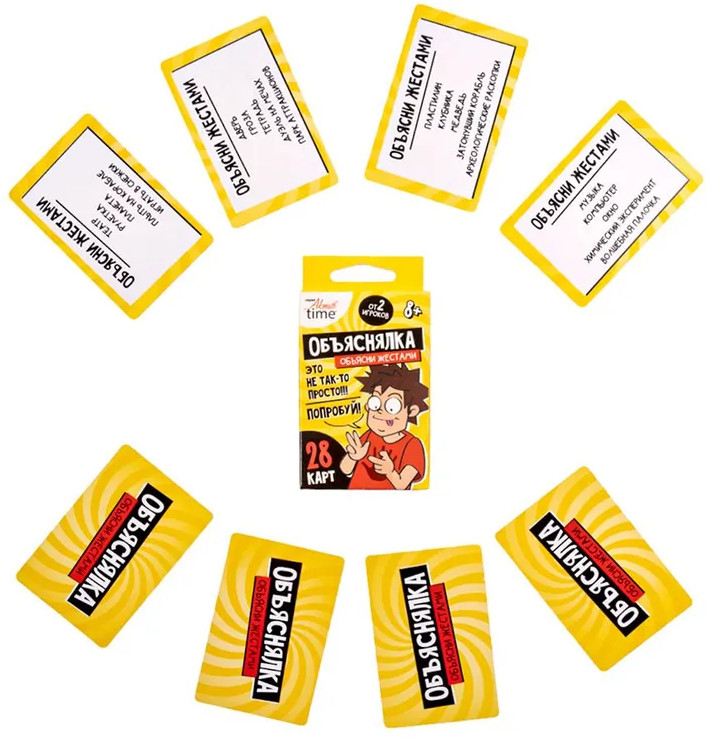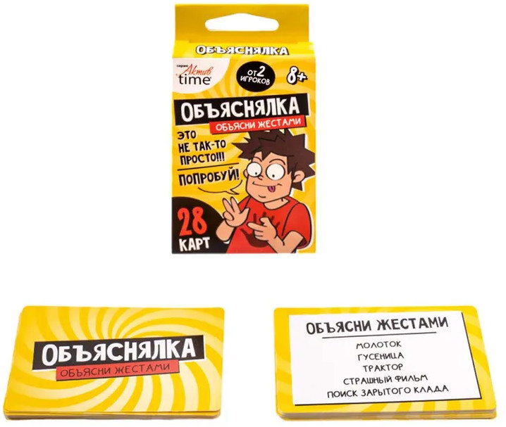 💳 Оплатить за товар можно при получении 🇰🇿 Есть бесплатная доставка по Казахстану от 1 дня 🎁 Копите бонусы с каждой покупки Серия: Актив time Веселая настольная игра-объяснялка «Объясни жестами». Серия «Актив time» — это игра для компании из 2 и более игроков. Тяни задание и объясняй заданные слова, не произнося ни звука, используя жесты! |