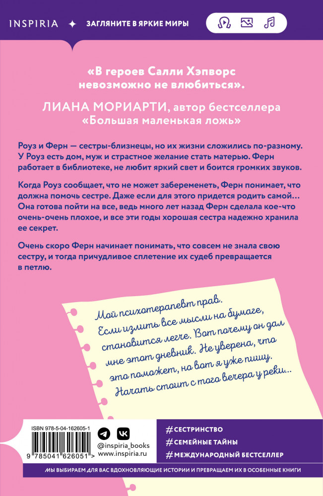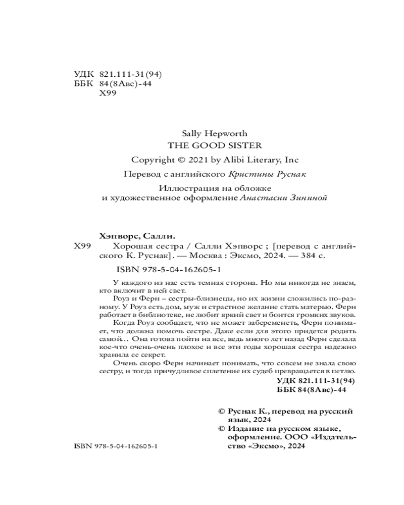 💳 Оплатить за товар можно при получении 🇰🇿 Есть бесплатная доставка по Казахстану от 1 дня 🎁 Копите бонусы с каждой покупки Серия: Novel. Бестселлеры Буктока. Салли Хэпворс Мировой бестселлер. Салли Хэпворс откровенно пишет о семейных секретах и хитросплетенных отношениях. Ее сюжеты наполнены дерзостью и очаровательно-мрачными красками. «Хорошая сестра» — это стильный покет с клапанами и дополнительными материалами к книге. Идеальный выбор, если вы не планируете спать до утра. |