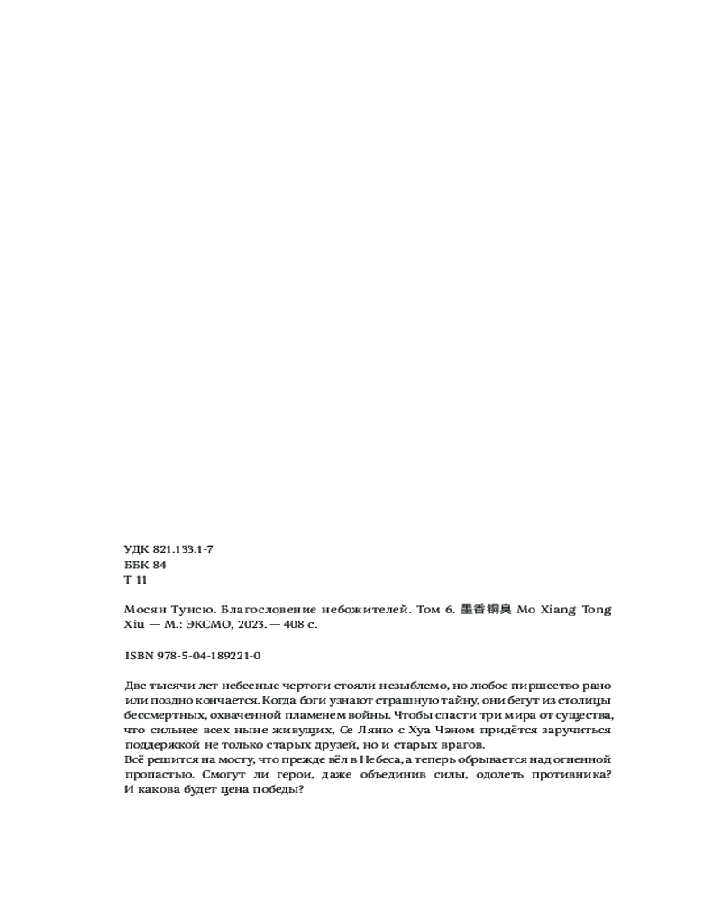 Благословение небожителей. Том 6В данный момент этот товар отсутствует в продаже. Возможно, у нас найдется аналогичный или похожий товар здесь. Серия: Благословение небожителей Сказать по правде, в этом мире нет богов. |