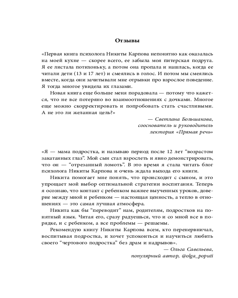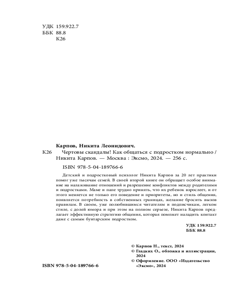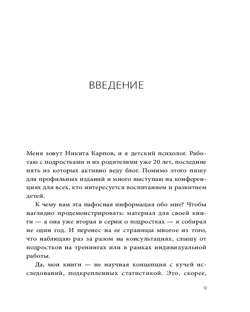 Серия: Диалог с подростком. Книги от детского и подросткового психолога Никиты Карпова Детский и подростковый психолог Никита Карпов помог уже многим семьям. В своей второй книге он обращает особое внимание на налаживание отношений и разрешение конфликтов между родителями и подростками. Маме и папе трудно принять, что их ребенок взрослеет, и от этого меняется не только его поведение и приоритеты, но и стиль общения, появляется потребность в собственных границах, желание бросить вызов правилам. В своем уже полюбившемся читателям и подписчикам легком стиле, с долей юмора и при этом на полном серьезе, Никита Карпов предлагает эффективную стратегию общения, которая поможет наладить контакт даже с самым бунтарским подростком.