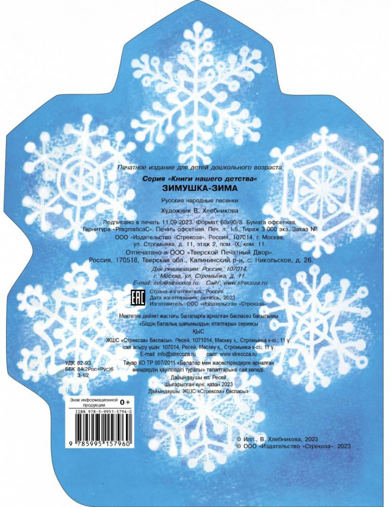 💳 Оплатить за товар можно при получении 🇰🇿 Есть бесплатная доставка по Казахстану от 1 дня 🎁 Копите бонусы с каждой покупки Серия: Книги нашего детства. Издается более... Эта красивая фигурная книжка-снежинка — прекрасный подарок на Новый год для малышей: девочек и мальчиков. А для их родителей — повод вспомнить свое собственное детство, ведь она издаётся уже более 30 лет. В книгу вошли народные песенки, потешки и загадки о зиме. Иллюстрации Веры Хлебниковой — уютные и колоритные — хочется рассматривать снова и снова. |