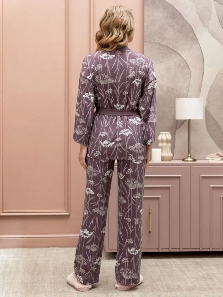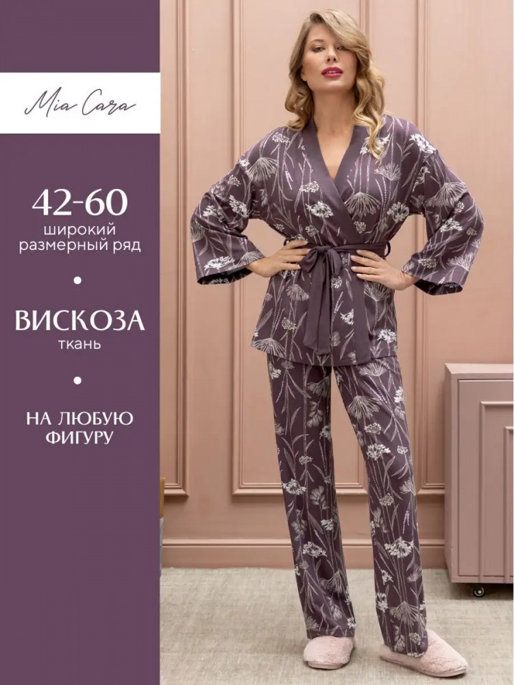 Костюм пижамный — кимоно с брюками Mia Cara — это элегантный и удобный комплект домашней одежды из вискозы. Он состоит из рубашки на запах и прямых брюк, выполненных из шелковистой трикотажной вискозы. В этом костюме вы будете чувствовать себя комфортно и стильно одновременно. Кардиган-кимоно данного комплекта имеет свободный объем и рукав ¾, что создает элегантный и изысканный образ. Фиксация на внутренние завязки и съемный пояс обеспечивают возможность подогнать кимоно под вашу фигуру и добавить нотку индивидуальности вашему образу. Прямые брюки с поясом на резинке и манжетами по низу из отделочной ткани придают этому костюму особый шарм и добавляют элементы стиля. Благодаря ним вы сможете не только ощущать комфорт, но и выглядеть модно и привлекательно.