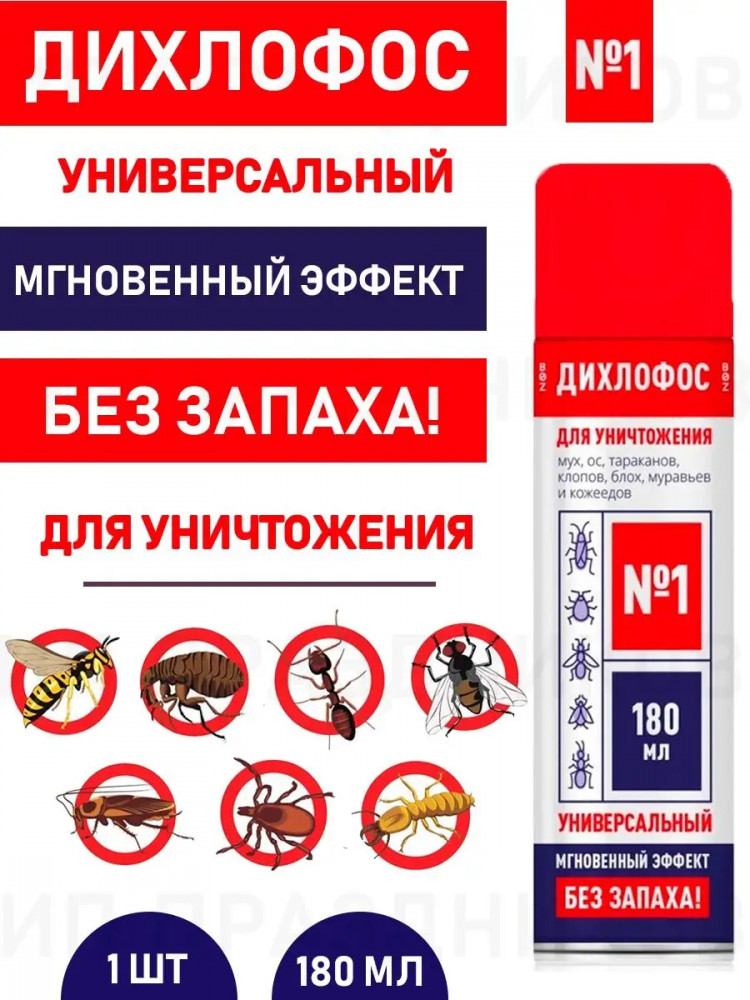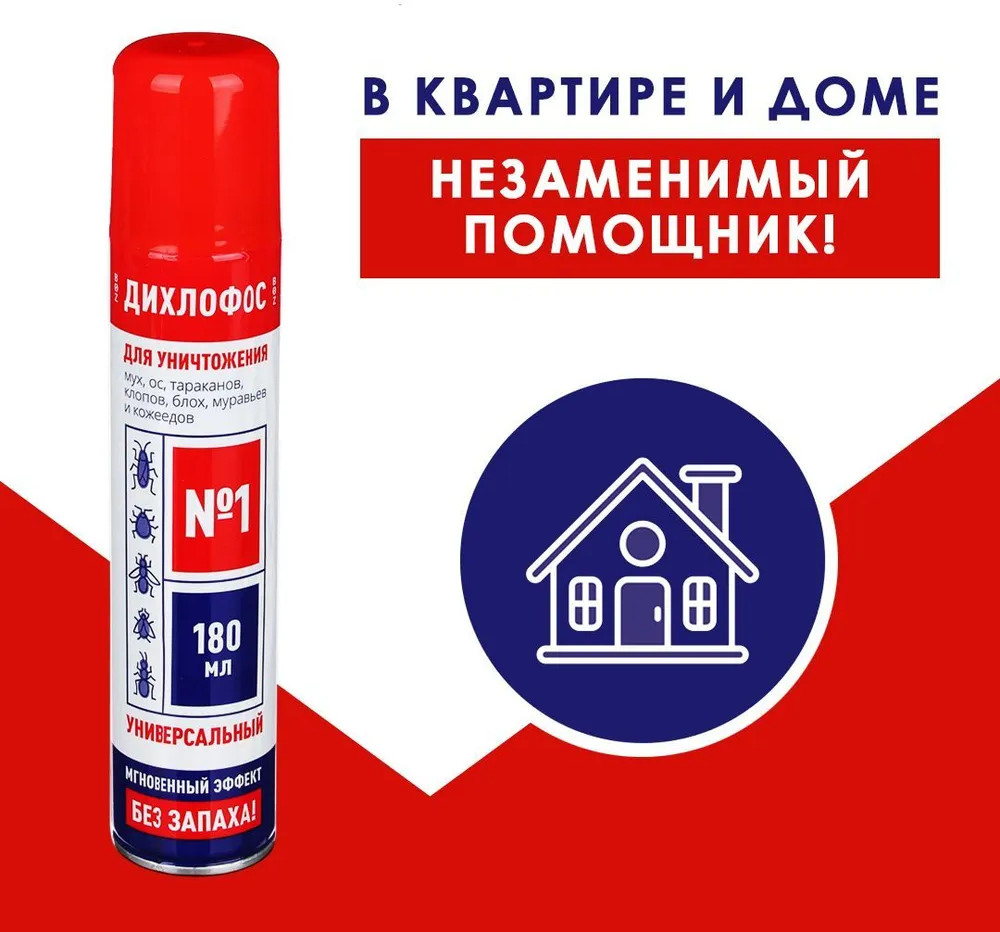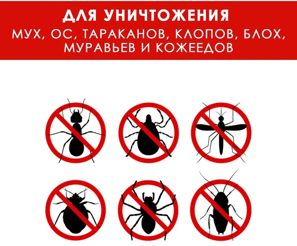 Для уничтожения в помещениях летающих и нелетающих насекомых: мух, комаров, москитов, бабочек моли, ос, с так же тараканов, блох, клопов, муравьёв и кожеедов.