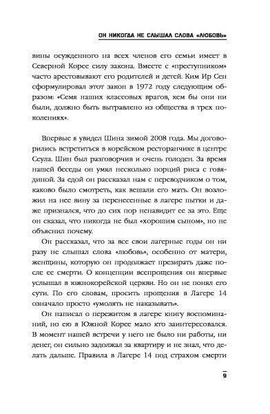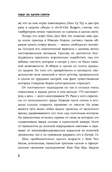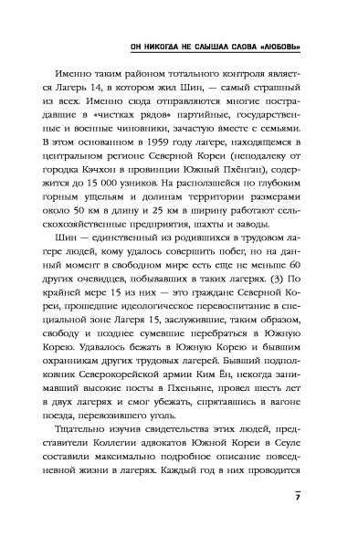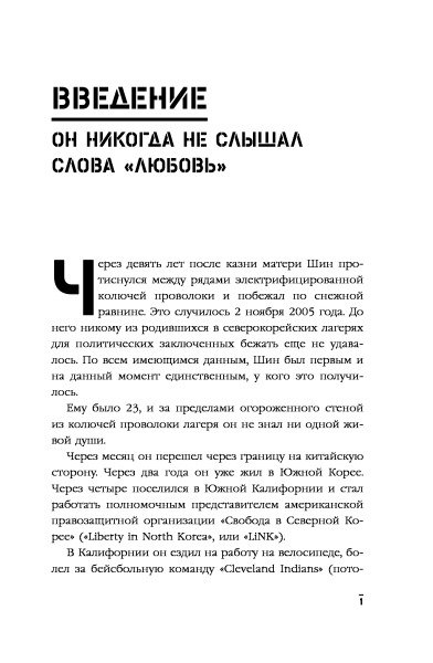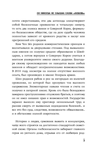 Друзья о чем Вы? Это не книга, а книга о книге!! Весь сюжет построен на том, что ВОТ ВОТ ВОТ и начнется самое интересное!! Сплошная пропаганда книги, не раскрыта тема! Первые страницы читал с огромным ожиданием, но после уже тупо дочитывал, сожалея о зря потерянном времени. Судите сами, абзац первый как ему плохо, абзац второй - статистика о том, что делают "демократы", чтобы помочь жителям Северной Кореи, и так вся книга! И непонятно читаешь ты о жизни Шина, или о добродетелях.