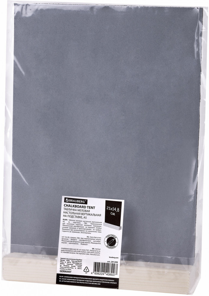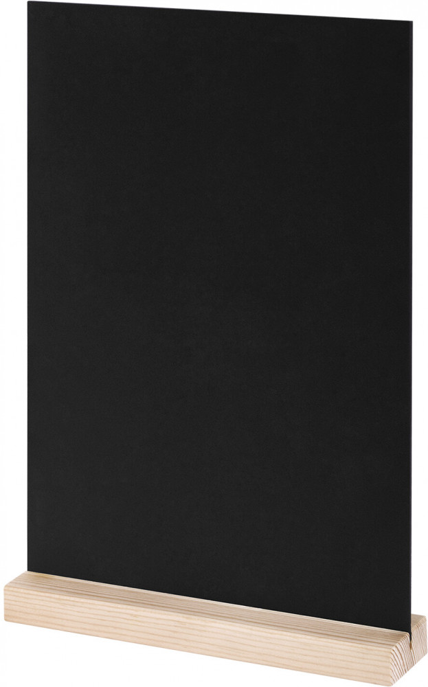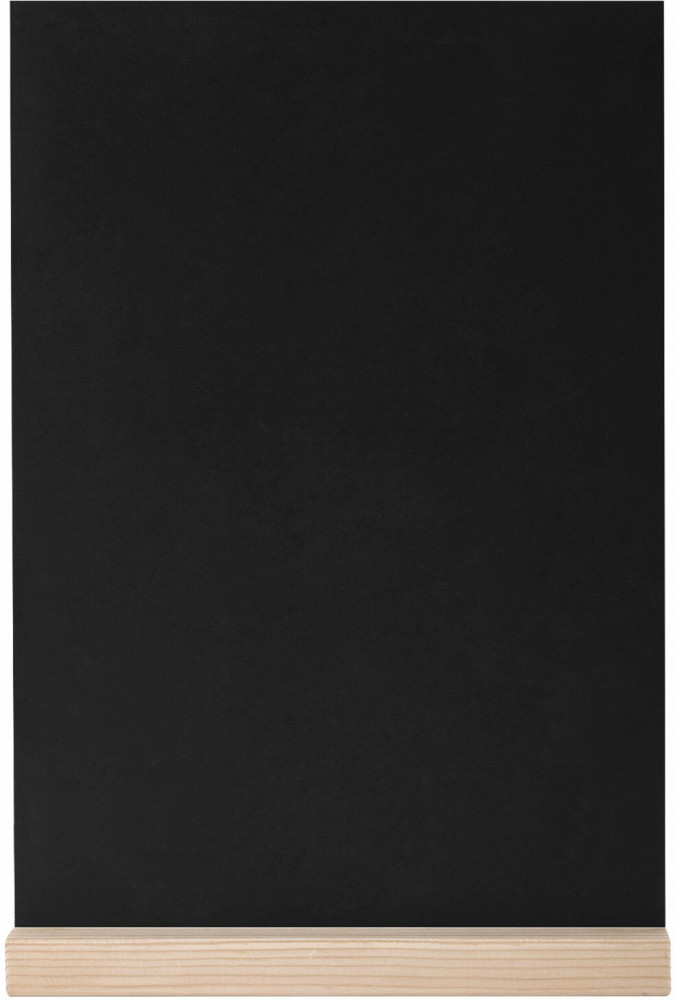 Табличка меловая настольная на деревянной подставке формата А5. Материал ценника — ПВХ черного цвета, толщина 3 мм. Материал деревянной подставки — сосна. Упаковка комплекта — пакет с клеевым краем. Для нанесения информации необходимо использовать меловые маркеры. Перед использованием удалите защитную пленку с рабочей поверхности. Рекомендуем использовать слегка влажную тканную салфетку (например, из микрофибры) для качественного и бережного удаления записей и долговременного использования поверхности.