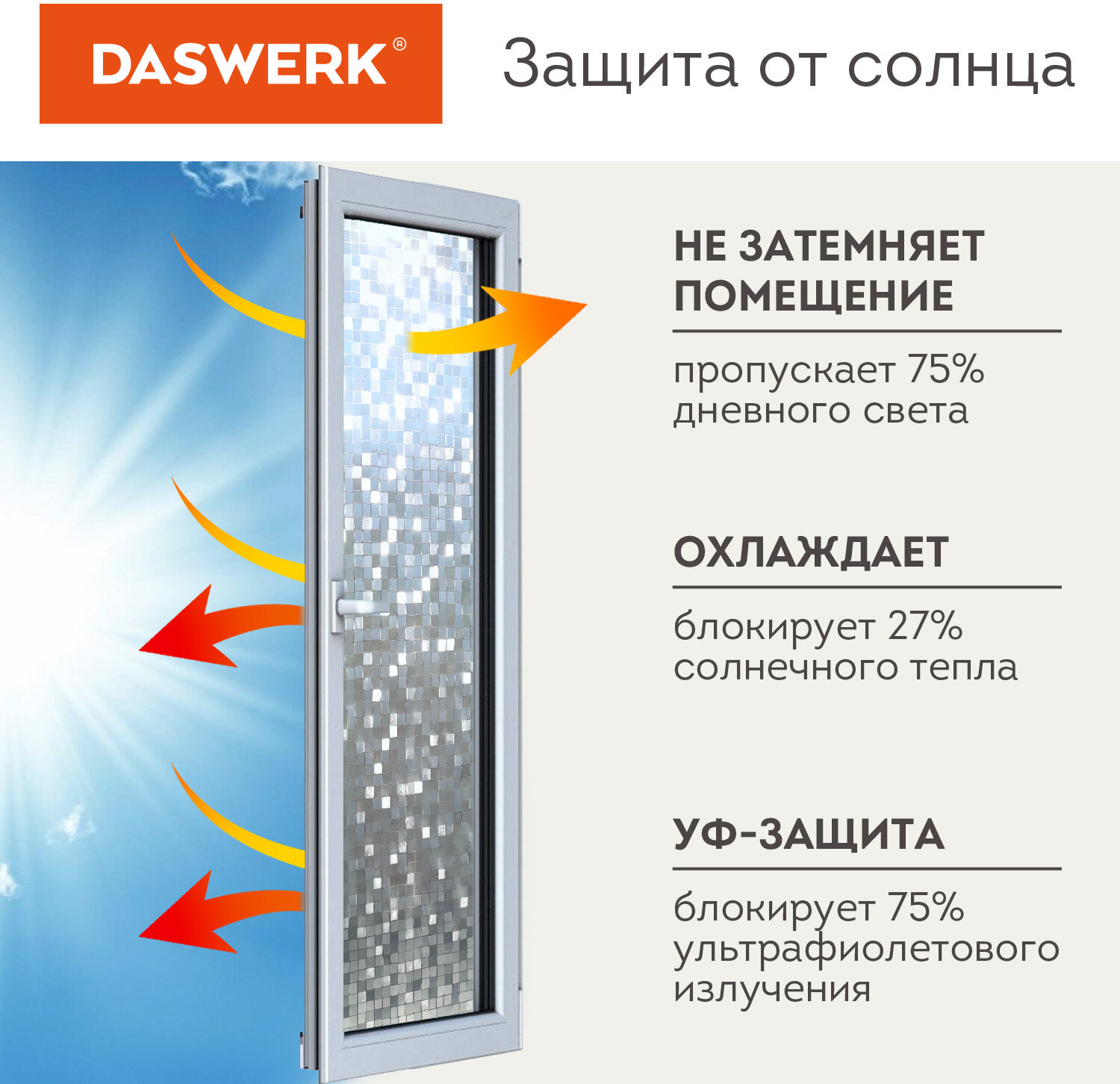 💳 Оплатить за товар можно при получении 🇰🇿 Есть бесплатная доставка по Казахстану от 1 дня 🎁 Копите бонусы с каждой покупки Оконная плёнка эффективно защищает помещения, мебель или растения от избыточного ультрафиолетового излучения, а также обеспечивает необходимую приватность и защиту от постороннего внимания. Плёнка на окно поставляется в рулоне шириной 75 см и длиной 1,5 м. Плёнка подходит для установки на комнатные и балконные окна, стеклянные двери и перегородки, дверцы шкафов и полок, а также дверцы и перегородки душевых кабин. Оконная плёнка не затемняет помещение, пропуская 75% солнечного света и тепла. Отражая 75% ультрафиолетового излучения, плёнка защищает предметы мебели и интерьера от выгорания и потери внешнего вида. Лицевая поверхность обладает эффектом «радуги» — при попадании солнечных лучей на плёнку свет преломляется, превращая окно в яркий витраж, украшающий и подчёркивающий интерьер, а также защищающий от любопытных взглядов. |