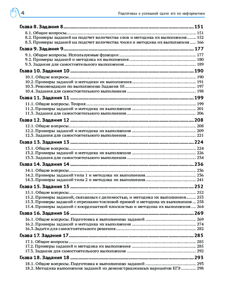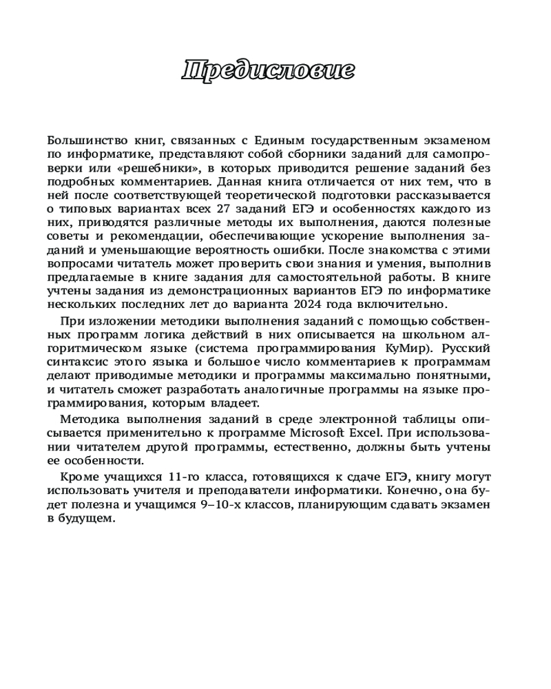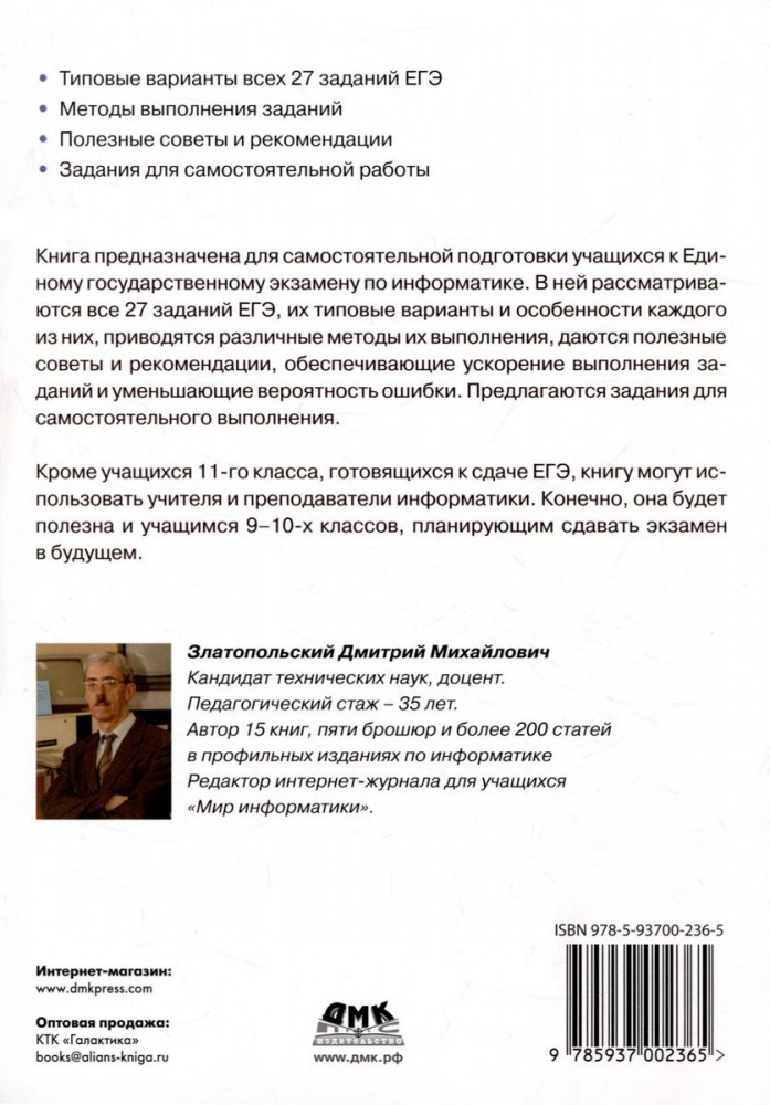 💳 Оплатить за товар можно при получении 🇰🇿 Есть бесплатная доставка по Казахстану от 1 дня 🎁 Копите бонусы с каждой покупки Книга предназначена для самостоятельной подготовки учащихся к Единому государственному экзамену по информатике. В ней рассматриваются все 27 заданий ЕГЭ, их типовые варианты и особенностях каждого из них, приводятся различные методы их выполнения, даются полезные советы и рекомендации, обеспечивающие ускорение выполнения заданий и уменьшающие вероятность ошибки. Предлагаются задания для самостоятельного выполнения. |