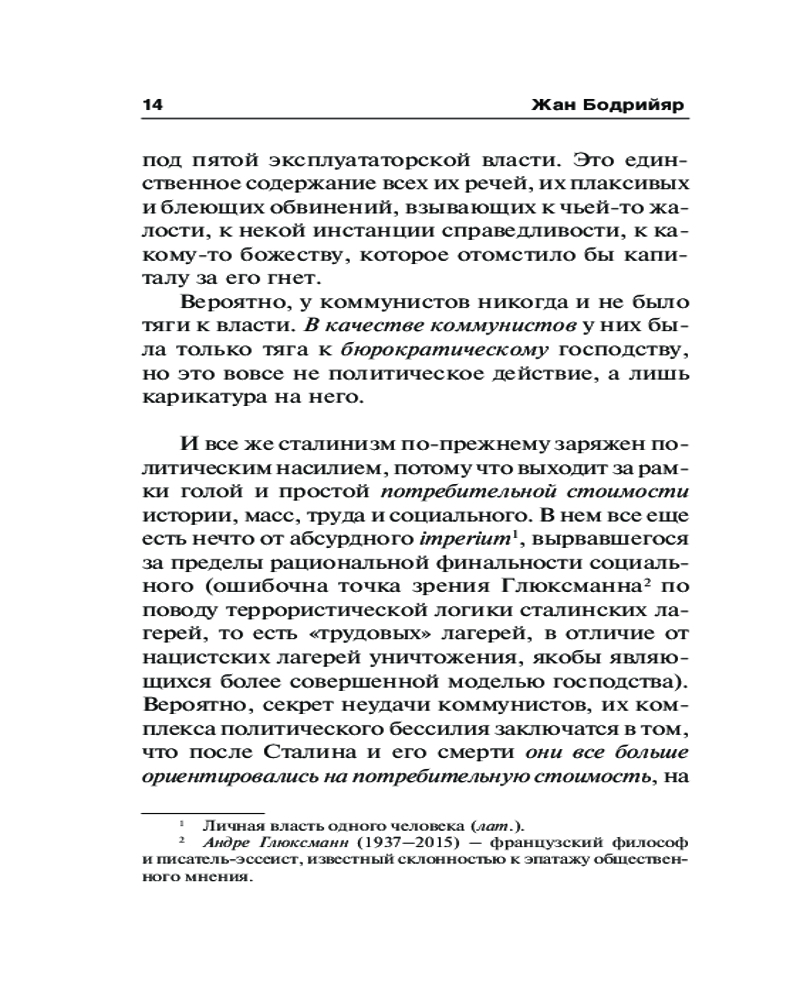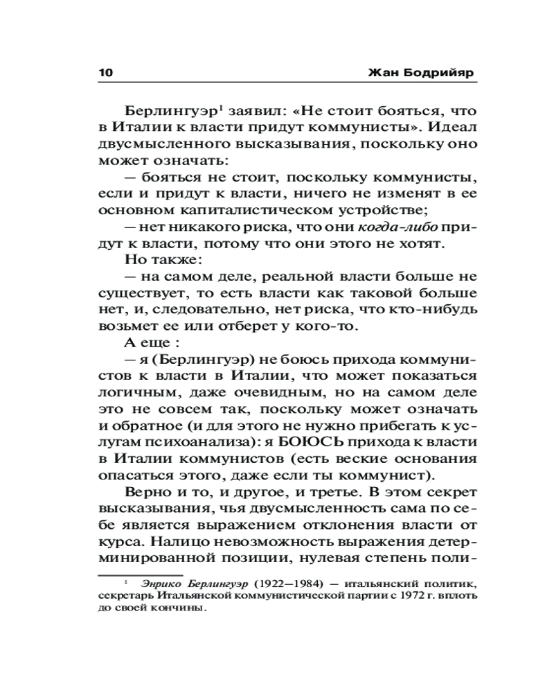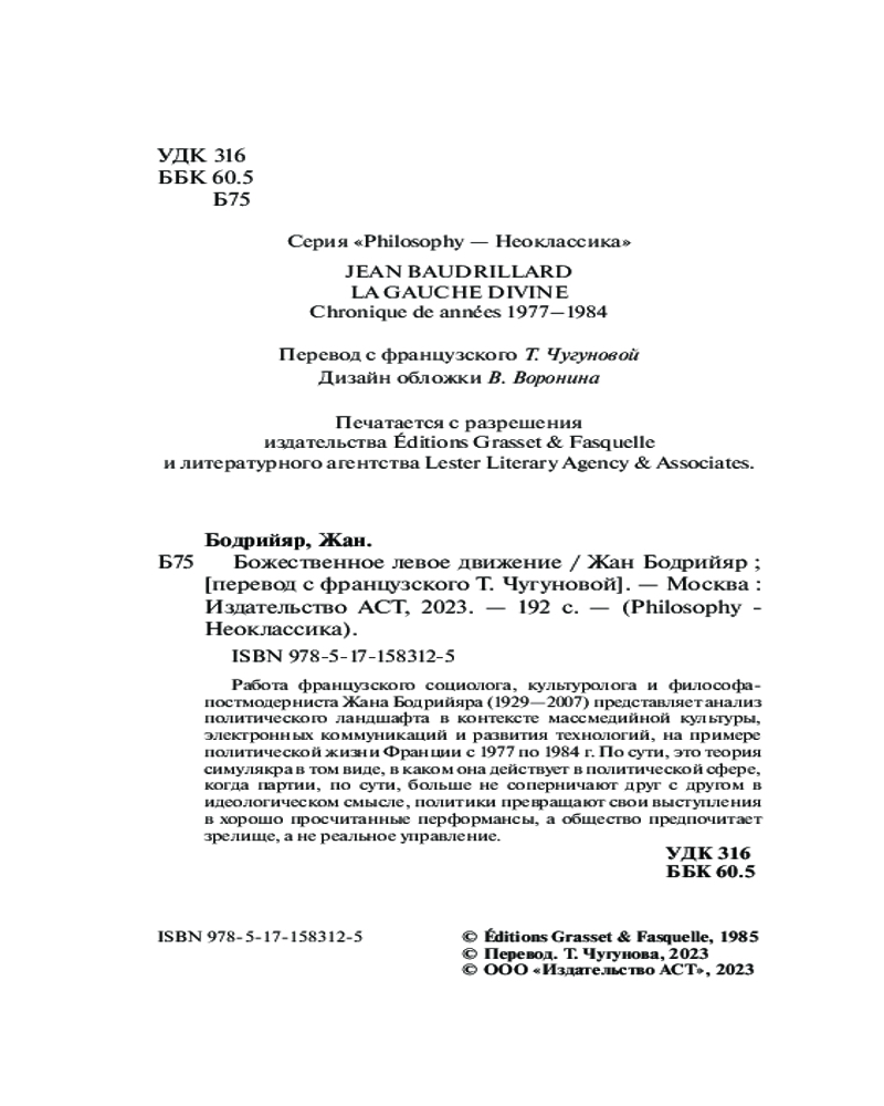 Божественное левое движениеВ данный момент этот товар отсутствует в продаже. Возможно, у нас найдется аналогичный или похожий товар здесь. Серия: Philosophy — неоклассика Работа французского социолога, культуролога и философа-постмодерниста Жана Бодрийяра (1929–2007) представляет анализ политического ландшафта в контексте массмедийной культуры, электронных коммуникаций и развития технологий, на примере политической жизни Франции с 1977 по 1984 г. По сути, это теория симулякра в том виде, в каком она действует в политической сфере, когда партии, по сути, больше не соперничают друг с другом в идеологическом смысле, политики превращают свои выступления в хорошо просчитанные перформансы, а общество предпочитает зрелище, а не реальное управление. |