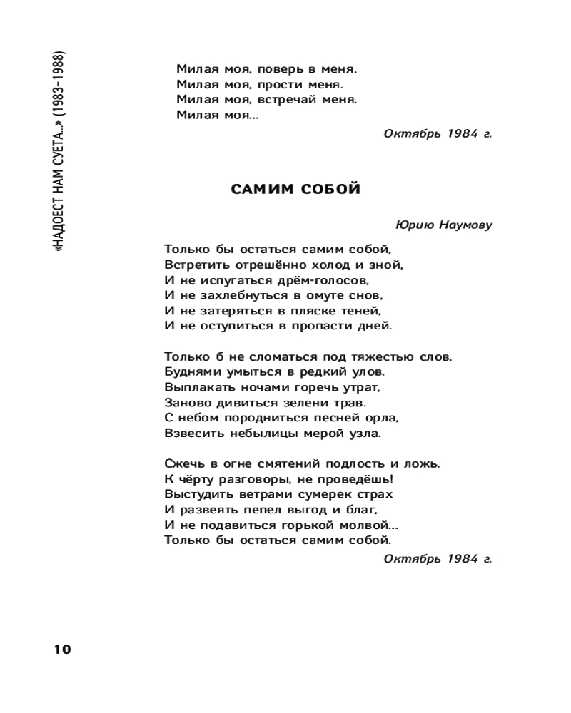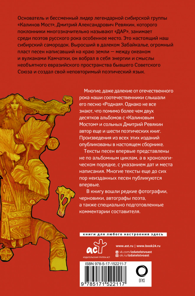 Дмитрий Александрович Ревякин, которого поклонники уважительно и с очевидным намеком называют «ДАР» — настоящий наш сибирский самородок. Выросший в далеком Забайкалье, огромный пласт песен написавший на краю земли — между океаном и вулканами Камчатки, он вобрал в себя энергии и смыслы необъятного евразийского пространства бывшего Советского Союза и создал свой неповторимый поэтический язык. Многие, даже далекие от отечественного рока наши соотечественники слышали его песню «Родная». Однако не все знают, что помимо более чем двух десятков альбомов с «Калиновым Мостом» и сольных, он еще и автор шести поэтических книг. Произведения из всех этих изданий представлены в настоящем сборнике. Тексты песен впервые расположены не по альбомным циклам (знаменитые «Выворотень», «Дарза», «Узарень», «Пояс Ульчи», «Оружие» и т.д.), а в хронологическом порядке с указанием дат и места написания, так что становится очевиден общий генезис многих произведений, выход которых в свет порой разделяли десятки лет. Более того, многие тексты еще до сих пор неизданных песен публикуются впервые, а ведь целый ряд таких «новинок» относятся к теперь уже классическому периоду творческого расцвета Ревякина «девяностых» годов. В книгу вошли редкие фотографии, черновики, автографы поэта. |