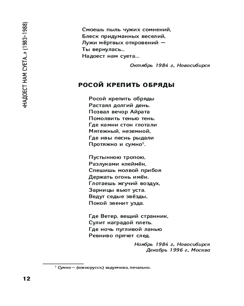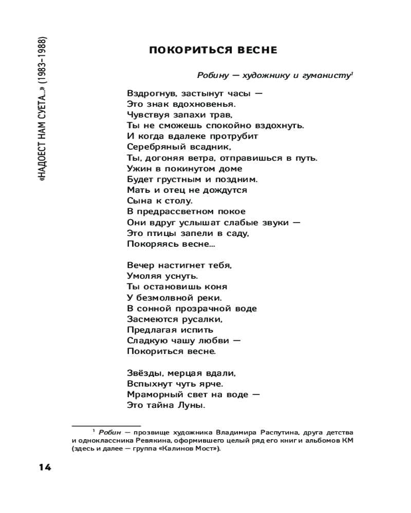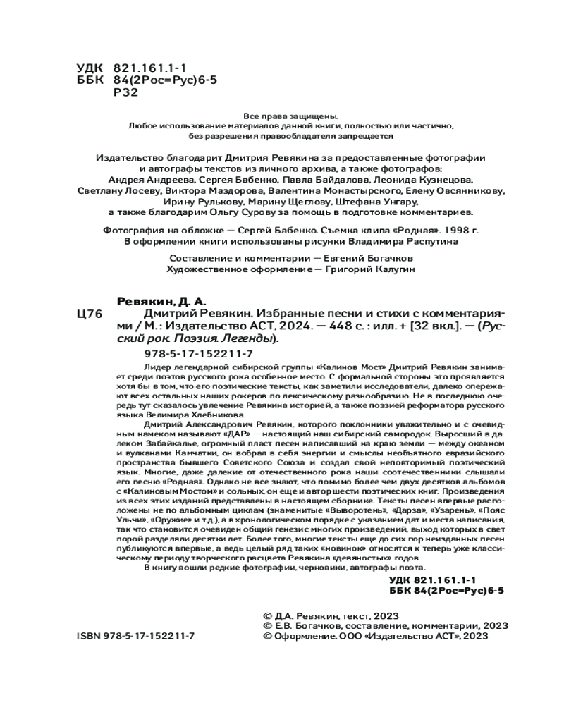Серия: Русский рок. Поэзия. Легенды Лидер легендарной сибирской группы «Калинов Мост» Дмитрий Ревякин занимает среди поэтов русского рока особенное место. С формальной стороны это проявляется хотя бы в том, что его поэтические тексты, как заметили исследователи, далеко опережают всех остальных наших рокеров по лексическому разнообразию. Не в последнюю очередь тут сказалось увлечение Ревякина историей, а также поэзией реформатора русского языка Велимира Хлебникова.