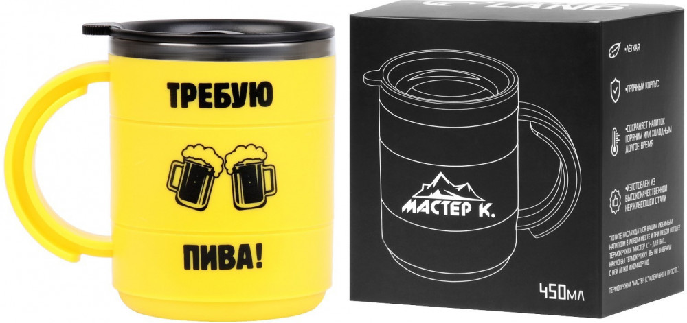 Мастер К Термокружка «Требую пива»В данный момент этот товар отсутствует в продаже. Возможно, у нас найдется аналогичный или похожий товар здесь. Термокружка — незаменимый помощник в повседневной жизни. Будь это дальняя поездка, обычная прогулка или просто рабочий день в офисе — любимый напиток всегда с собой. Изделие из прочной нержавеющей стали выдержит любые испытания в экстремальном путешествии или на весёлом пикнике. Термокружка станет практичным аксессуаром и отличным подарком для самых близких. |