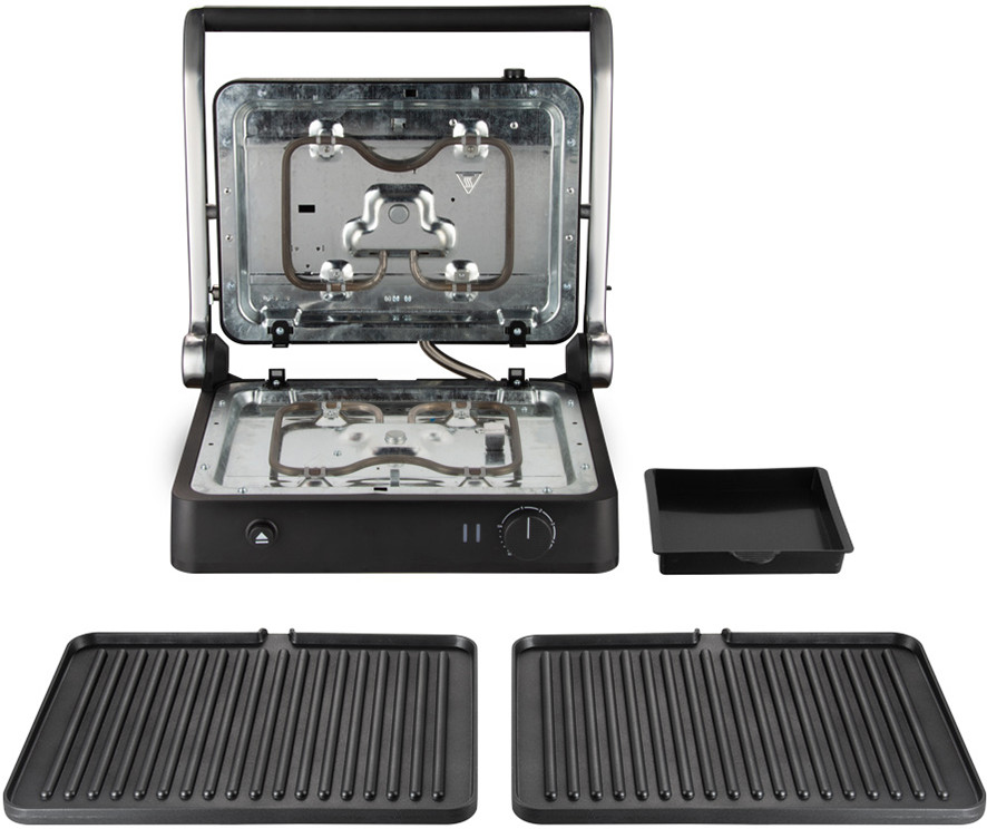 На корпусе гриля расположен регулятор нагрева, который позволяет настроить подходящую температуру для каждого продукта — например, котлет для бургеров или овощей.