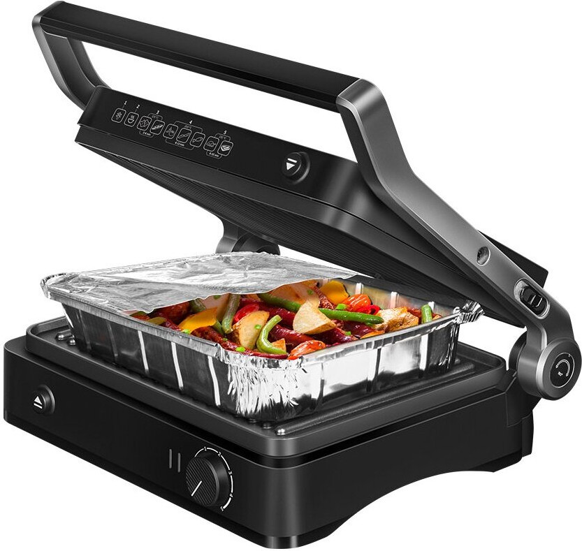 • как духовку Запекайте омлеты, пироги, овощные и мясные рагу как в духовке! Просто выложите ингредиенты в алюминиевую форму*, накройте фольгой и поставьте между панелей, опустив крышку гриля.