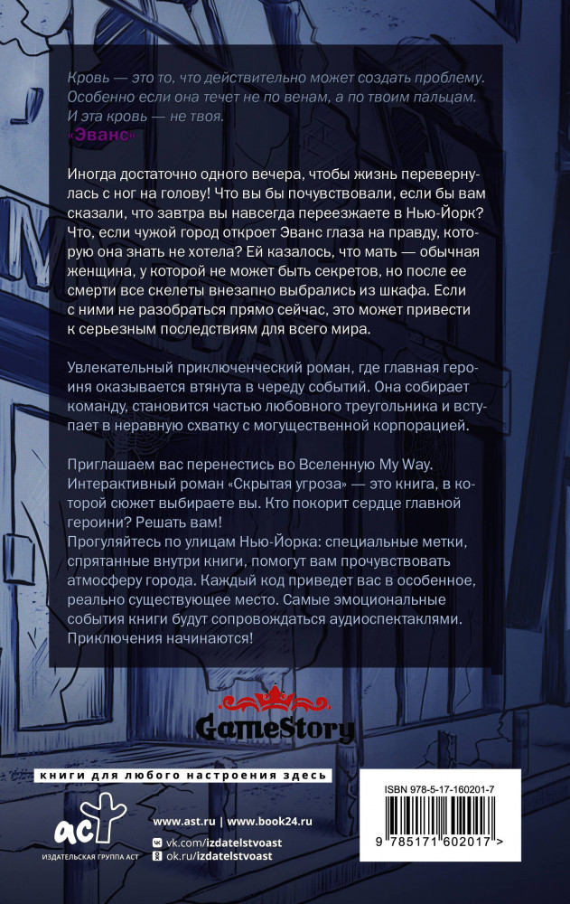 💳 Оплатить за товар можно при получении 🇰🇿 Есть бесплатная доставка по Казахстану от 1 дня 🎁 Копите бонусы с каждой покупки Серия: GameStory. My Way stories Ей семнадцать, и никто не называет ее по имени. Родители души в ней не чают, преподаватели прочат большое будущее, а еще она прочно поселилась в сердце главного красавчика школы. Однако один осенний вечер широким мазком перечеркивает ее жизнь. Теперь все по-новому: Нью-Йорк, школа, возлюбленный. Но сперва нужно разобраться с последствиями одной роковой ошибки, которая уже стоила стольких жизней... |