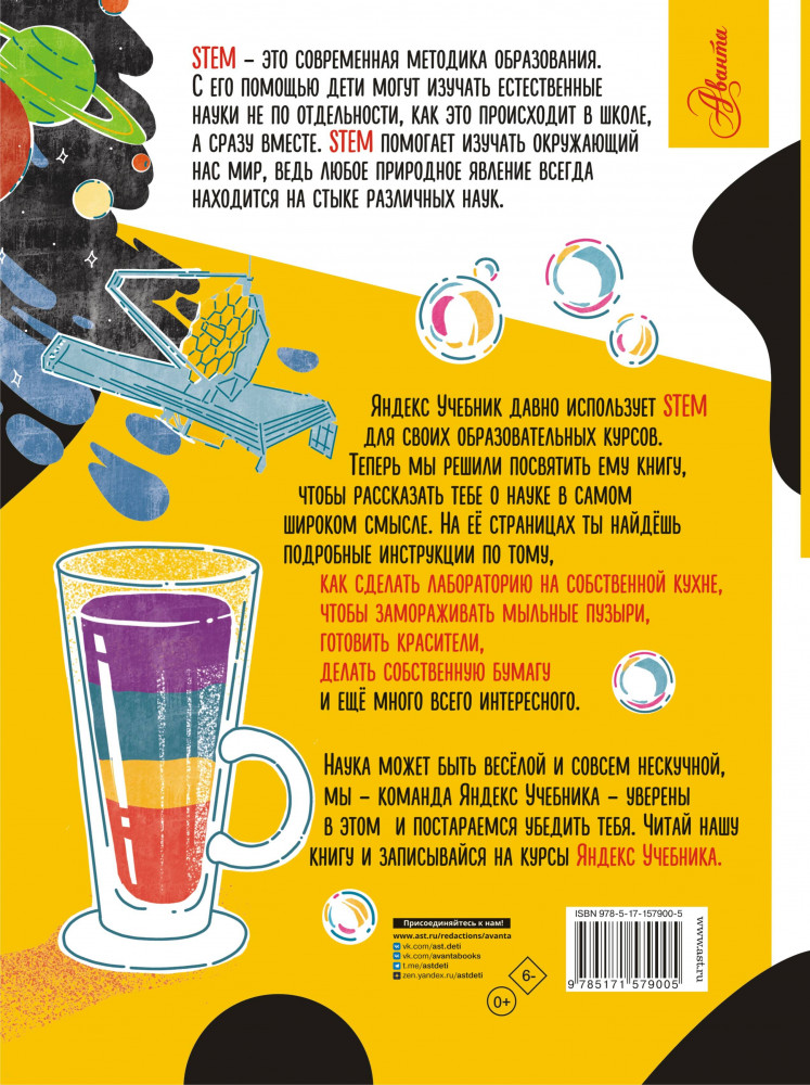 💳 Оплатить за товар можно при получении 🇰🇿 Есть бесплатная доставка по Казахстану 🎁 Копите бонусы с каждой покупки Серия: Яндекс учебник STEM — это современная образовательная методика. Она объединяет естественные науки, делает учёбу интересной и активной. Поэтому эта книга понравится всем, кто любит науку в самом широком смысле, любит задавать самые разные вопросы о природе. Она основана на курсе «Окружающий мир» от Яндекс Учебника. В ней ты найдёшь инструкции по тому, как замораживать мыльные пузыри, сделать собственную бумагу и вырастить кристаллы дома. |