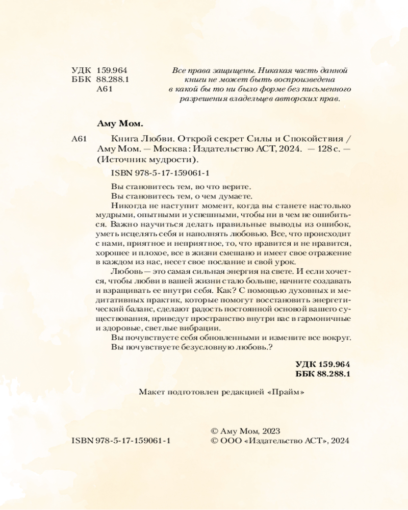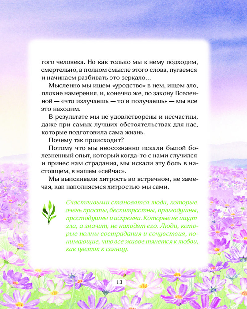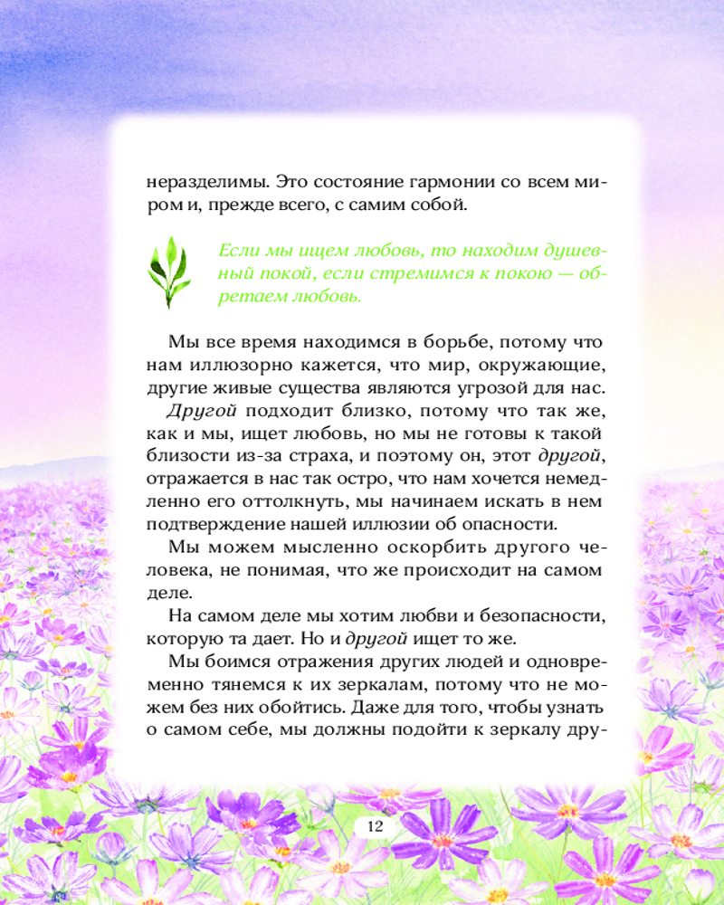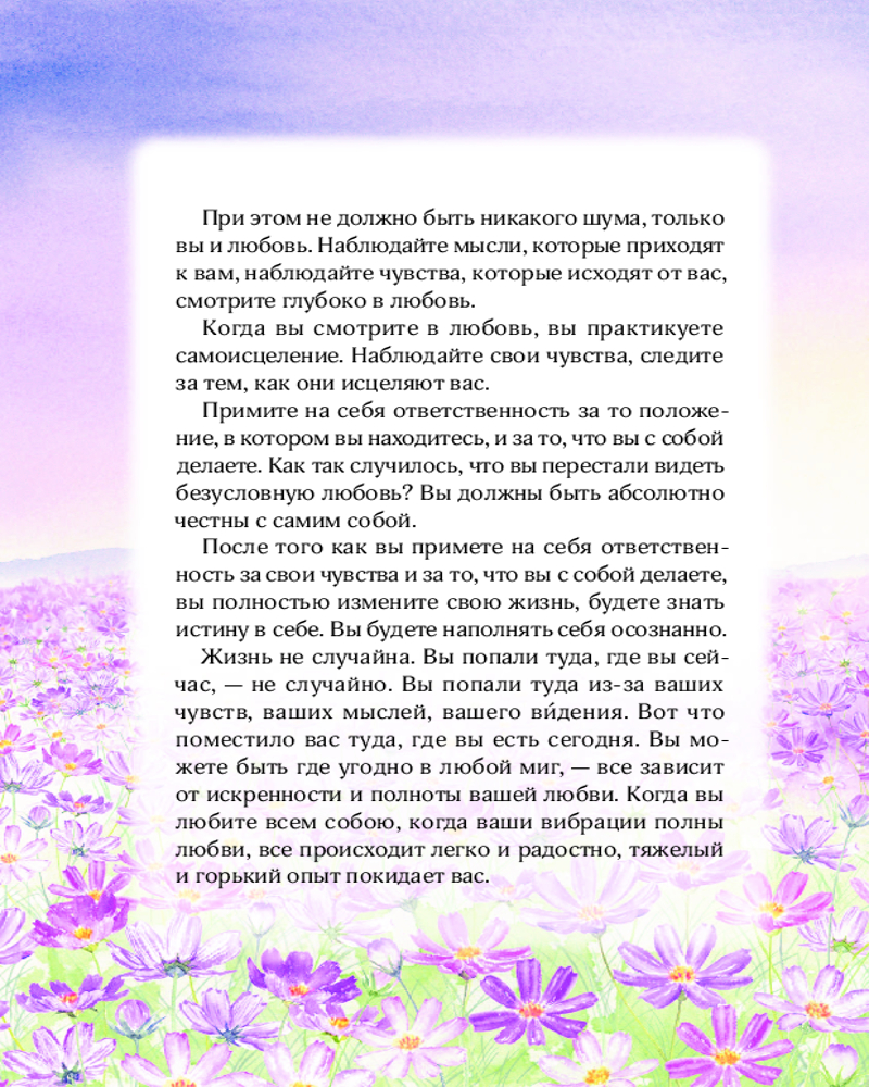 Книга Любви. Открой секрет Силы и СпокойствияВ данный момент этот товар отсутствует в продаже. Возможно, у нас найдется аналогичный или похожий товар здесь. Серия: Источник мудрости Никогда не наступит мoмент, когда вы станете настолько мудрыми, опытными и успешными, чтобы ни в чем не ошибиться. Важно научиться делать правильные выводы из ошибок, уметь исцелять себя и наполнять любовью. Все, что происходит с нами, приятное и неприятное, то, что нравится и не нравится, хорошее и плохое, все в жизни смешано и имеет свое отражение в каждом из нас, несет свое послание и свой урок. |