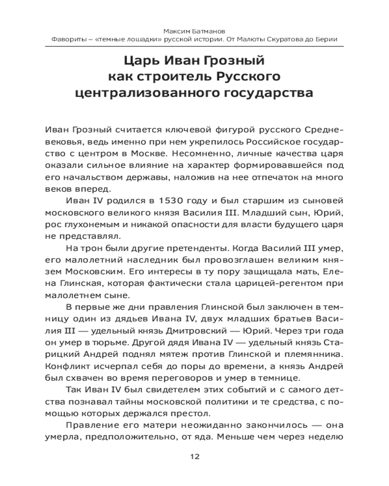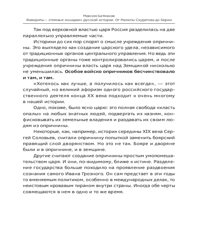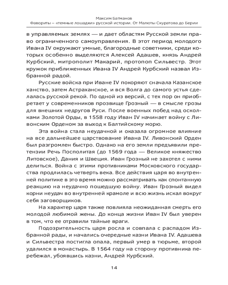 Фавориты — «темные лошадки» русской истории. От Малюты Скуратова до Лаврентия Берии. 10 самых влиятельных приближенных российских властителейВ данный момент этот товар отсутствует в продаже. Возможно, у нас найдется аналогичный или похожий товар здесь. Серия: Личность в истории Максим Батманов, автор канала об отечественной истории, крупнейшего на площадке Дзен, представляет свой взгляд на знаменитых исторических деятелей. Фавориты. Любимцы царей, возлюбленные императриц, доверенные лица императоров и вождей. Кровавые соратники Скуратов и Берия. Недооцененные реформаторы Аракчеев и Голицын. Тайные мужья Потемкин и Разумовский. Властолюбцы Никон и Бирон. Царские друзья Меншиков и Распутин. Они развязывали войны, подбивали властителей на реформы, вступали в конфликты с целым царским двором, обогащались и отказывались от даров. Непростые истории возвышения, трагические судьбы, падение с самой высоты и тайная жизнь тех, кто жил между плахой и троном, кто смог оставить о себе память в жизни целой страны. |