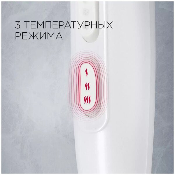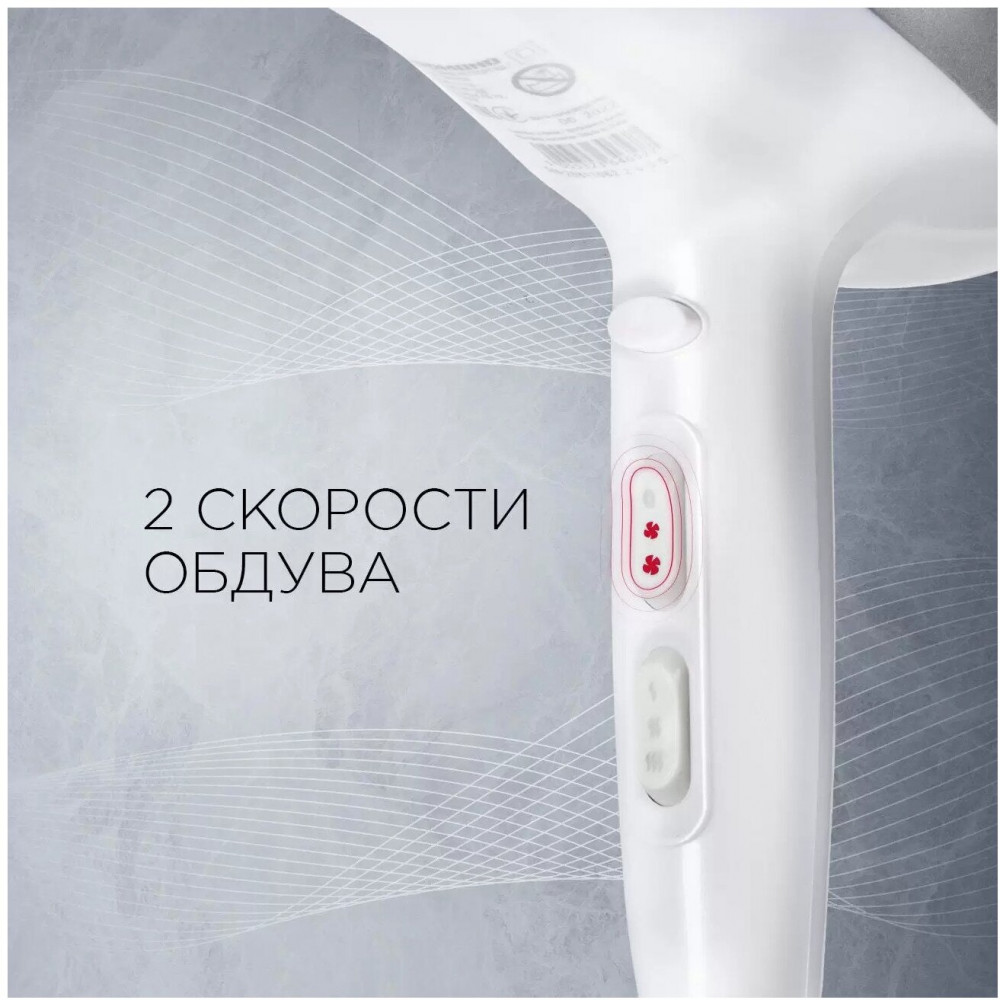 Установить уровень нагрева можно с помощью удобного переключателя на ручке. 1 — низкая температура. Для тонких, секущихся, окрашенных волос; 2 — средняя температура. Для нормальных или слегка вьющихся волос; 3 — высокая температура. Для жестких, густых, непослушных волос. 2 скорости Модель имеет две скорости воздушного потока: минимальная подходит для ухода за тонкими, короткими и ослабленными волосами, максимальная мощность оптимальна для сушки и укладки длинных и густых локонов.