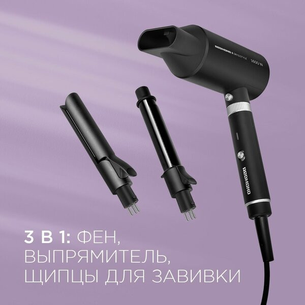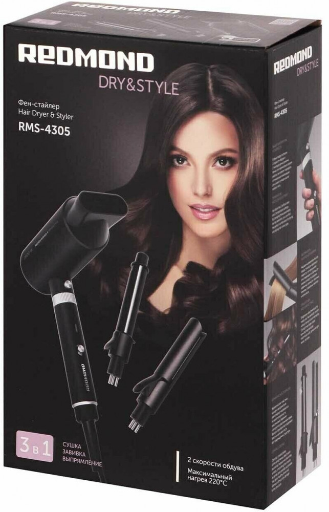 Redmond RMS-4305 — компактное устройство для сушки и укладки волос, который сочетает в себе функции фена, выпрямителя и щипцов для волос. Меняйте насадки, и создавайте новые яркие образы — легкие волны, объемные кудри или безупречно гладкие пряди.
