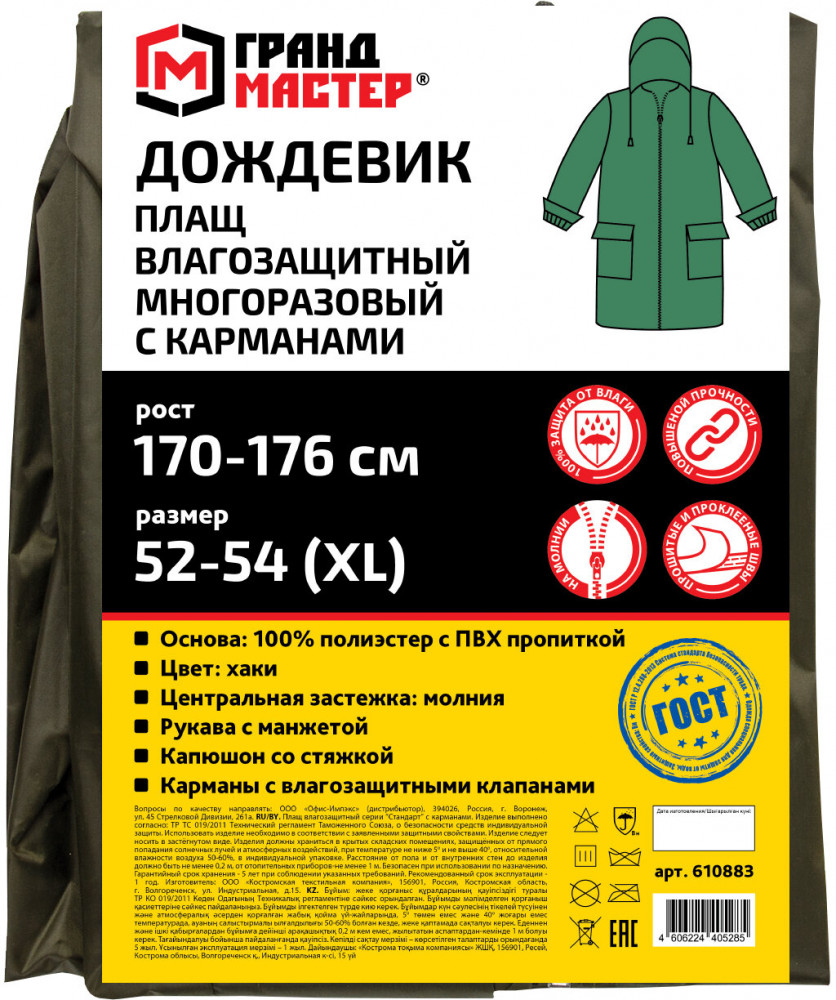 Многоразовый плащ-дождевик с карманами цвета хаки на молнии с ПВХ-покрытием «Грандмастер» предназначен для защиты от ветра, дождя и других атмосферных воздействий. Идеально подойдет для работы на улице, отдыха на природе, рыбалки, пикника и прогулок. Размер 52-54 (XL)