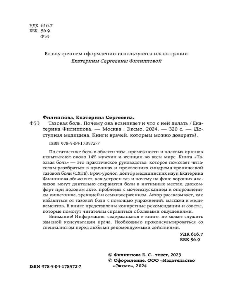 💳 Оплатить за товар можно при получении 🇰🇿 Есть бесплатная доставка по Казахстану от 1 дня 🎁 Копите бонусы с каждой покупки Серия: Доступная медицина. Книги врачей, которым можно доверять Чувствуете дискомфорт, жжение и боль «там»? Часто ходите в туалет? Испытываете боли во время секса? Давно и безуспешно лечитесь у урологов или гинекологов? Синдром хронической тазовой боли — заболевание, которое не вписывается в традиционные медицинские шаблоны и не поддается стандартным алгоритмам лечения. Оно возникает «из ниоткуда» — ни явных инфекций, ни патологии внутренних органов обнаружить не удается, а боль не проходит и продолжает красть вашу жизнь день за днем. |
