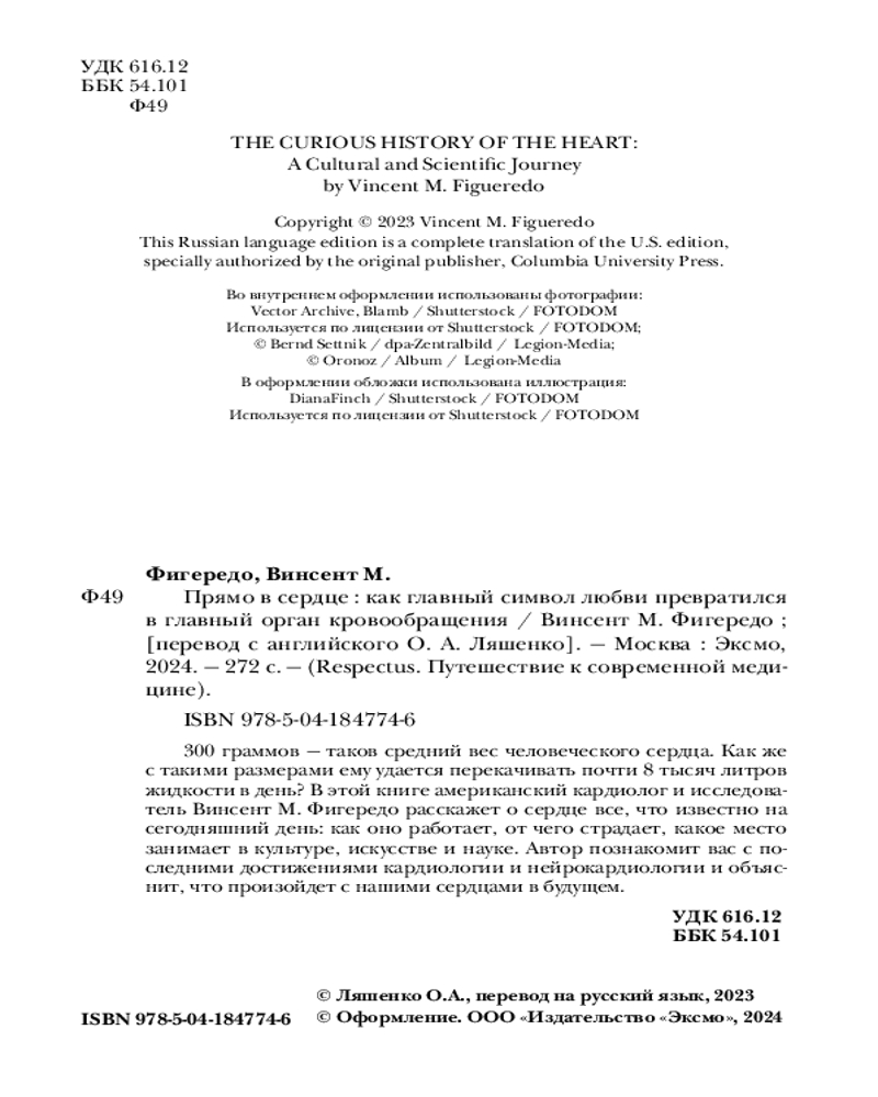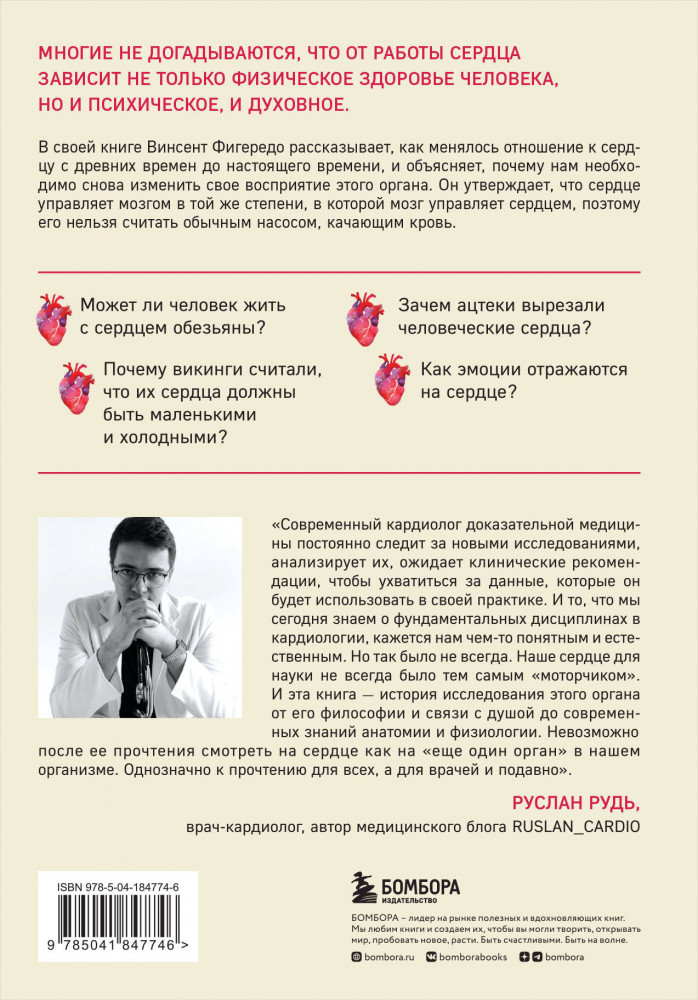 В данный момент этот товар отсутствует в продаже. Возможно, у нас найдется аналогичный или похожий товар здесь. Серия: Respectus. Путешествие к современной медицине Тысячи лет человек верил, что весь его разум и чувства заключены в сердце. Аристотель связывал сердце с душой и считал источником тепла, в то время как мозг воспринимался всего лишь «рефрижератором», предназначенным для охлаждения горячего сердца. Почему же все изменилось? В этой книге врач-кардиолог и исследователь Винсент М. Фигередо рассказывает, что значило сердце в разных культурах, как менялись представления о нем с зарождения цивилизации до наших дней и как научная мысль повлияла на достижения современной кардиологии.