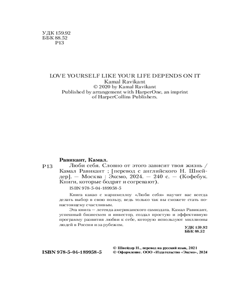 💳 Оплатить за товар можно при получении 🇰🇿 Есть бесплатная доставка по Казахстану от 1 дня 🎁 Копите бонусы с каждой покупки Серия: Кофебук. Книги которые бодрят и согревают Книга какао с маршмеллоу «Люби себя» научит вас всегда делать выбор в свою пользу, ведь только так вы сможете стать по-настоящему счастливым. Эта книга — легенда американского самиздата. Камал Равикант, успешный бизнесмен и инвестор, создал простую и эффективную программу развития любви к себе, которую используют миллионы людей в России и за рубежом. |