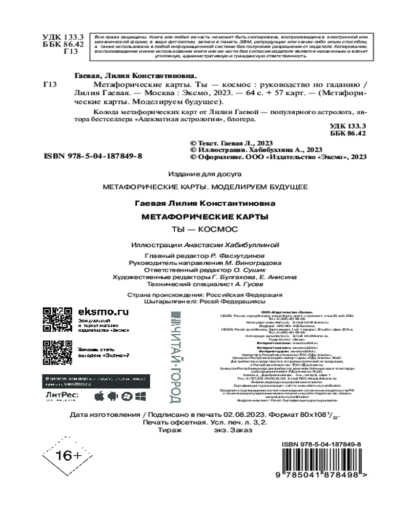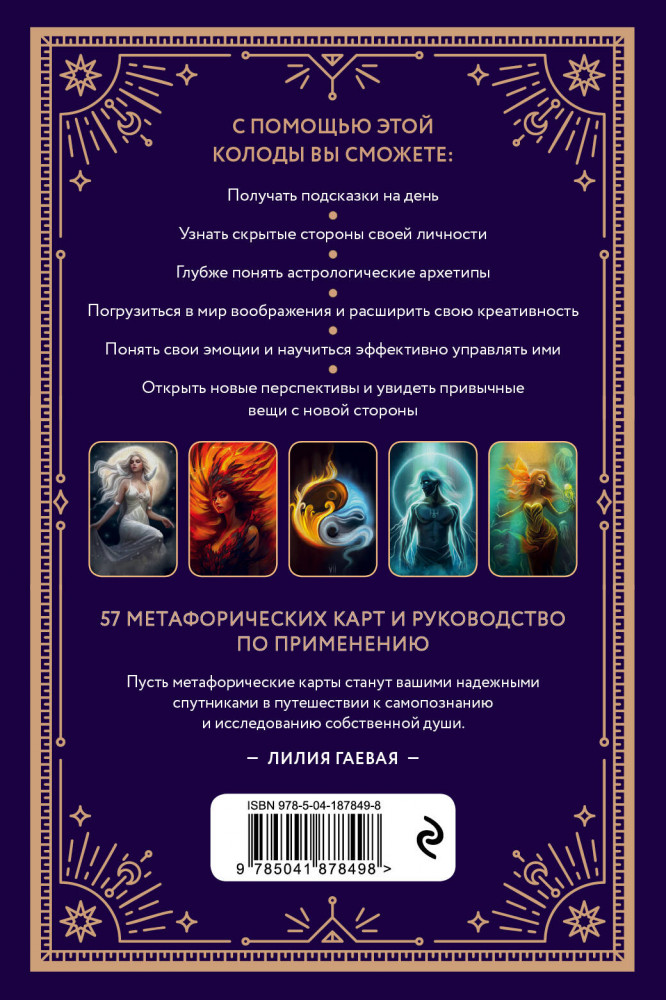 💳 Оплатить за товар можно при получении 🇰🇿 Есть бесплатная доставка по Казахстану от 1 дня 🎁 Копите бонусы с каждой покупки Серия: Метафорические карты. Моделируем будущее Колода метафорических карт от Лилии Гаевой — популярного астролога и автора бестселлера «Адекватная астрология». В метафорических картах «Ты — космос» сочетаются астрология, гадание и психология. В подарок к каждой колоде есть курс «Работа с метафорическими картами» с авторскими уроками и сертификатом о прохождении! |