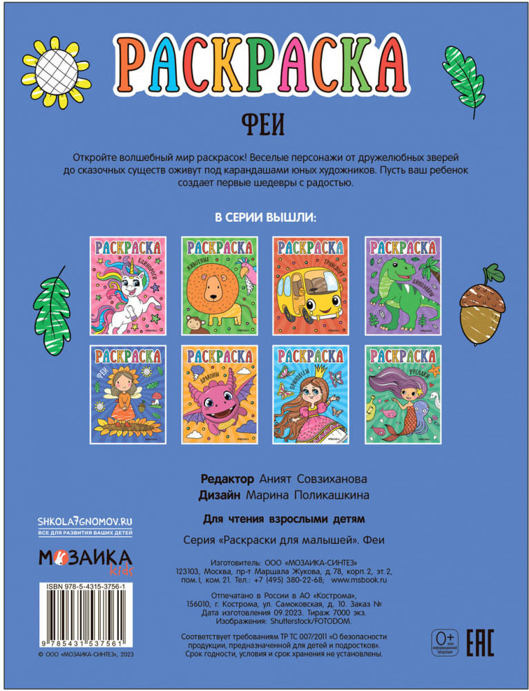 💳 Оплатить за товар можно при получении 🇰🇿 Есть бесплатная доставка по Казахстану от 1 дня 🎁 Копите бонусы с каждой покупки Серия: Раскраски для малышей С книгой «Феи» серии «Раскраски для малышей» ребенок сможет погрузиться в захватывающий мир фантазий и раскрасить очаровательных крылатых волшебниц. |