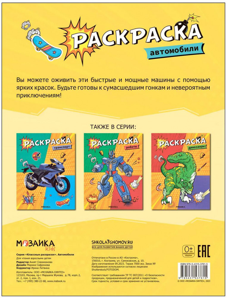 💳 Оплатить за товар можно при получении 🇰🇿 Есть бесплатная доставка по Казахстану от 1 дня 🎁 Копите бонусы с каждой покупки Серия: Классные раскраски Книга «Автомобили» серии «Классные раскраски» — путешествие в мир гонок для детей от 5 лет. На страницах ребенка ждет разнообразный транспорт — от ретромашин до мощных спорткаров. |