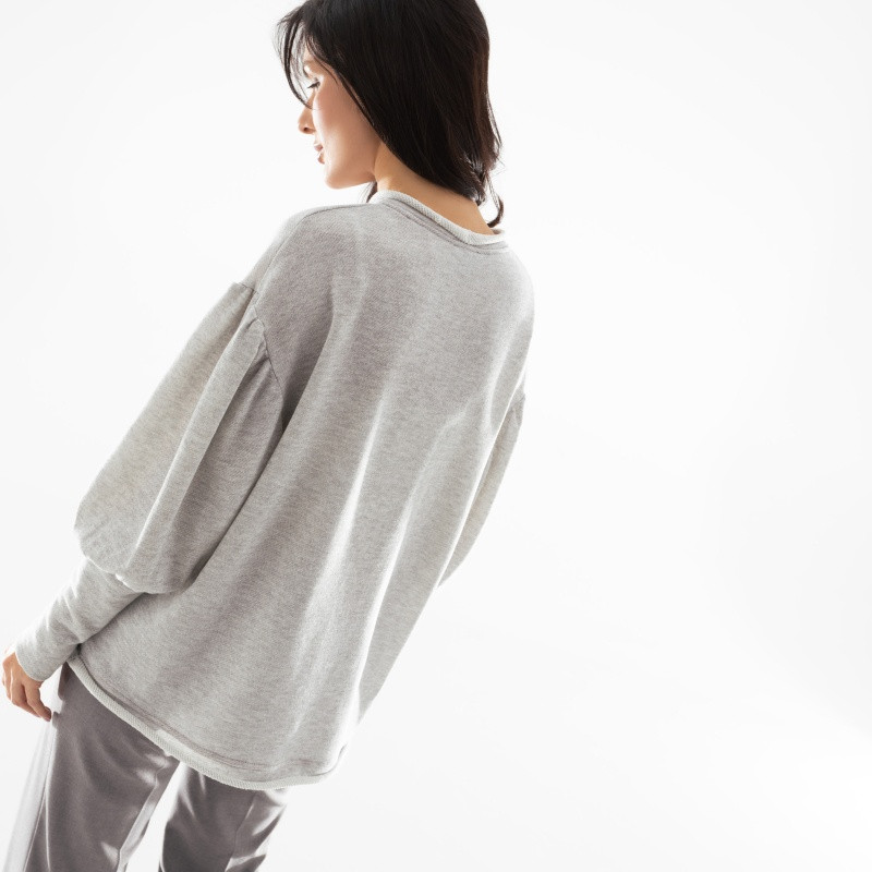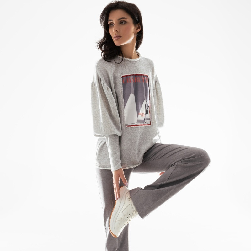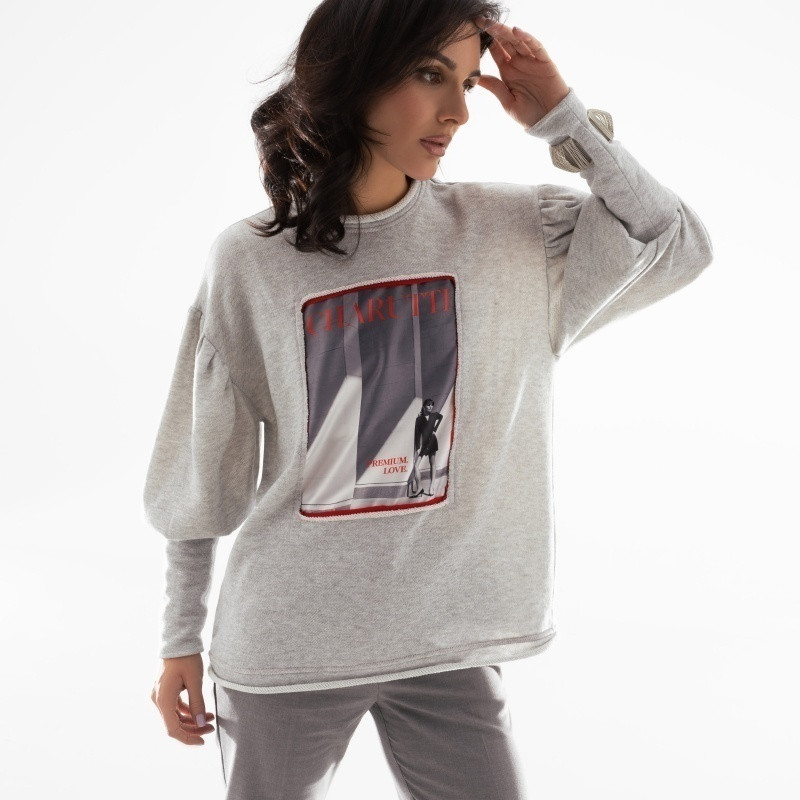Свитшот классный, оригинальный, для эффекта оверсайз купила 54 на свой 48, но всё равно почему-то рукава узковаты. Закатать рукава, к примеру чтобы руки помыть, не получается, но звезду снимать не стала. С серыми джинсами этого же бренда получился хороший ансамбль.