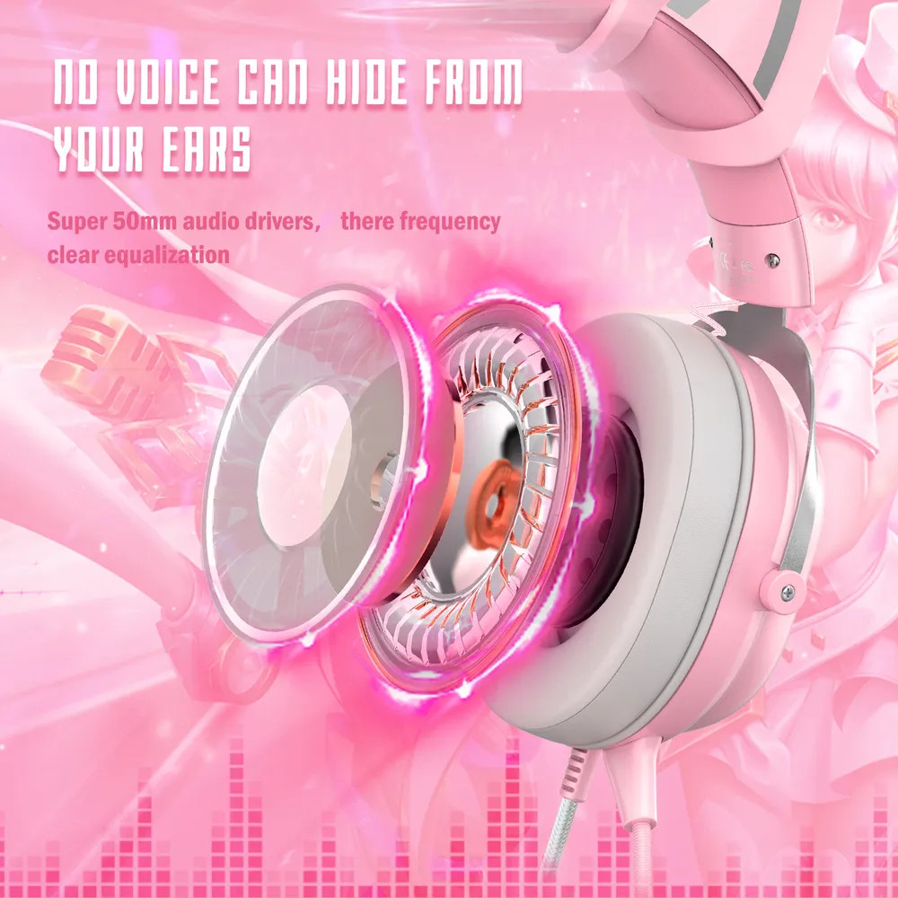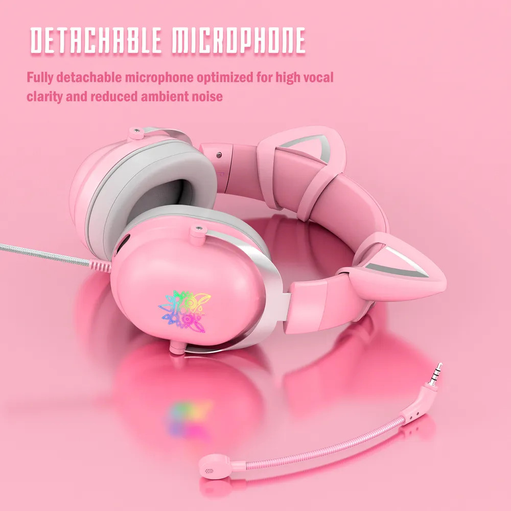 Наушники с ушками ONIKUMA Rose Cat выполнены в белом цвете. Другая отличительная особенность — наличие яркой RGB-подсветки, которая автоматически включается при подключении игровых наушников к вашему гаджету через USB-штекер. Наушники с подсветкой — это привлекательный атрибут и отличный подарок для геймера.