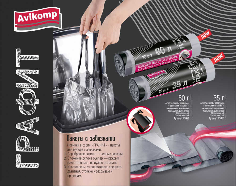 Группа компаний Avikomp — одна из ведущих компаний, обладающая современным производственным комплексом и специализирующаяся на производстве и продаже различных полимерных пленок, полиэтиленовой упаковки, пакетов для утилизации промышленных отходов и бытового мусора, а также салфеток и губок для уборки из различных материалов, виниловых, резиновых и нитриловых перчаток и других товаров для дома и дачи.