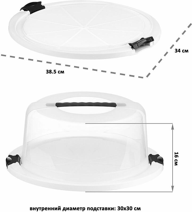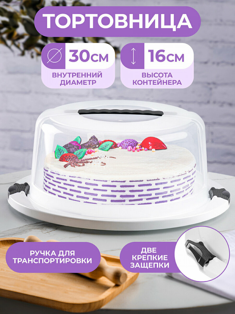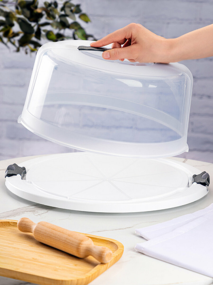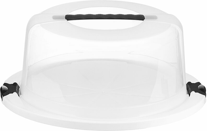 Прочная конструкция из двух клапанов обеспечивает плотное прилегание крышки. Таким образом, контейнер сохранит свежесть, вкус, целостность вашей выпечки и предотвратит попадание пыли и посторонних запахов. Блюдо с крышкой оборудовано ручкой с надежным креплением, что обеспечит комфортную переноску и защитит торт от повреждений.