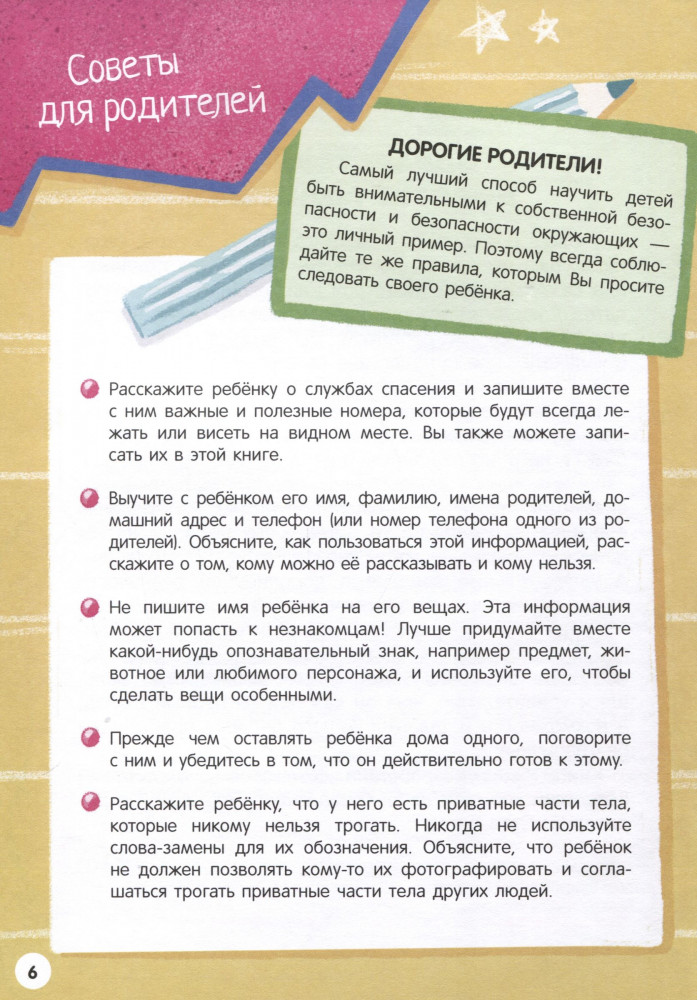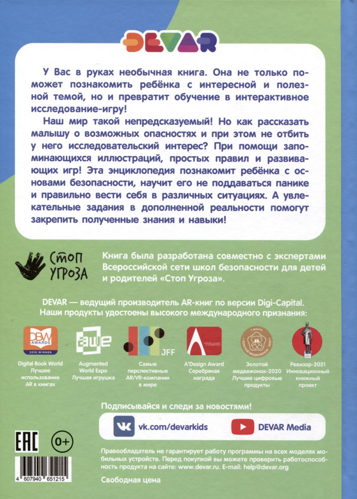 Моя первая энциклопедия. Правила безопасностиВ данный момент этот товар отсутствует в продаже. Возможно, у нас найдется аналогичный или похожий товар здесь. Серия: Моя первая энциклопедия Devar У Вас в руках необычная книга. Она не только поможет познакомить ребёнка с интересной и полезной темой, но и превратит обучение в интересное исследование-игру! Наш мир такой непредсказуемый! Но как рассказать малышу о возможных опасностях и при этом не отбить у него исследовательский интерес? При помощи запоминающихся иллюстраций, простых правил и развивающ: игр! Эта энциклопедия познакомит ребёнка с основами безопасности, научит его не поддаваться панике и правильно вести себя в различных ситуациях. А увлекательные задания в дополненной реальности помогут закрепить полученные знания и навыки! Книга была разработана совместно с экспертами Всероссийской сети школ безопасности для детей и родителей «Стоп Угроза». |