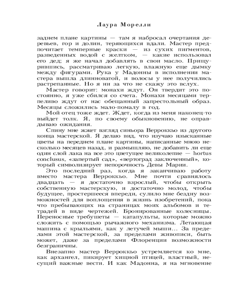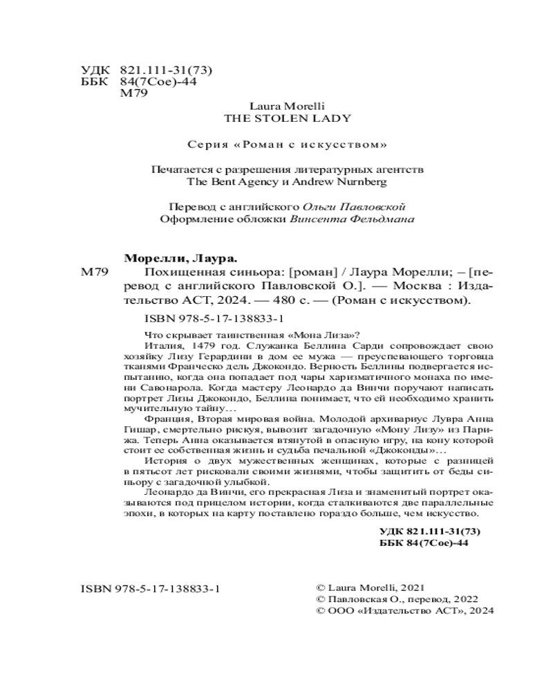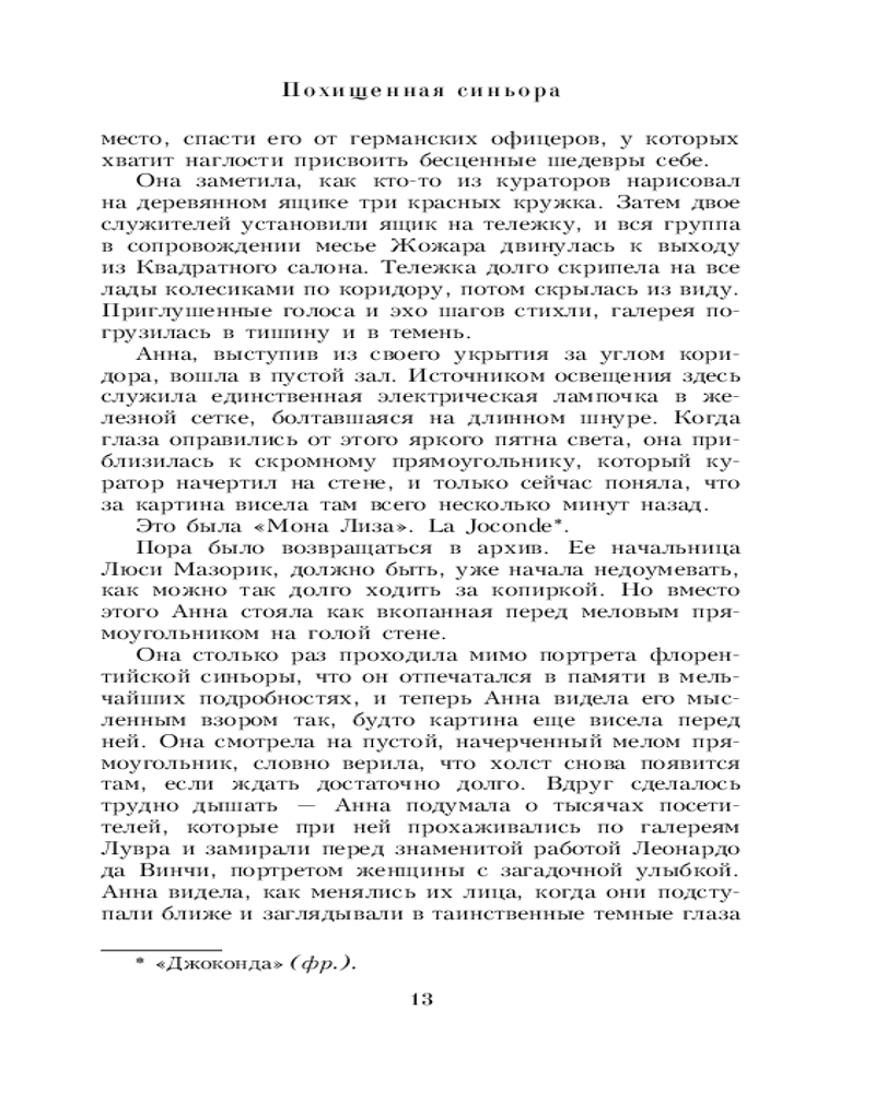 💳 Оплатить за товар можно при получении 🇰🇿 Есть бесплатная доставка по Казахстану от 1 дня 🎁 Копите бонусы с каждой покупки Серия: Роман с искусством Что скрывает таинственная «Мона Лиза»? Италия, 1479 год. Служанка Беллина Сарди сопровождает свою хозяйку Лизу Герардини в дом ее мужа — преуспевающего торговца тканями Франческо дель Джокондо. Верность Беллины подвергается испытанию, когда она попадает под чары харизматичного монаха по имени Савонарола. Когда мастеру Леонардо да Винчи поручают написать портрет Лизы Джокондо, Беллина понимает, что ей необходимо хранить мучительную тайну... Франция, Вторая мировая война. Молодой архивариус Лувра Анна Гишар, смертельно рискуя, вывозит загадочную «Мону Лизу» из Парижа. Теперь Анна оказывается втянутой в опасную игру, на кону которой стоит ее собственная жизнь и судьба печальной "Джоконды"... |