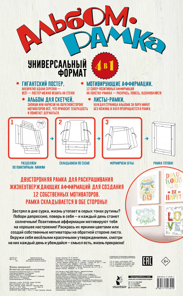 💳 Оплатить за товар можно при получении 🇰🇿 Есть бесплатная доставка по Казахстану от 1 дня 🎁 Копите бонусы с каждой покупки Серия: Гигантский альбом-рамка. Подарок своими руками без ножниц и клея Гигантский альбом-рамка — формат альбома для быстрого оформления стен рисунками, не требующий дополнительных вложений. Рисунки сразу складываются в готовую рамку! В альбоме плотная бумага — можно рисовать фломастерами, гелиевыми ручками, карандашами. Универсальный формат для творчества. Без ножниц и клея твоя работа в 3 шага складывается в рамку, которую легко повесить на стену. Двухсторонняя рамка для 12 мотиваторов или 12 собственных рисунков. Выбирай! Рамка складывается в обе стороны! Рисуй с одной стороны или раскрашивай с другой. |