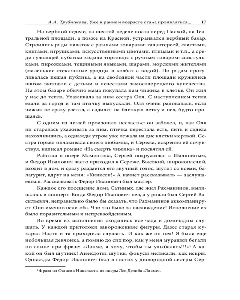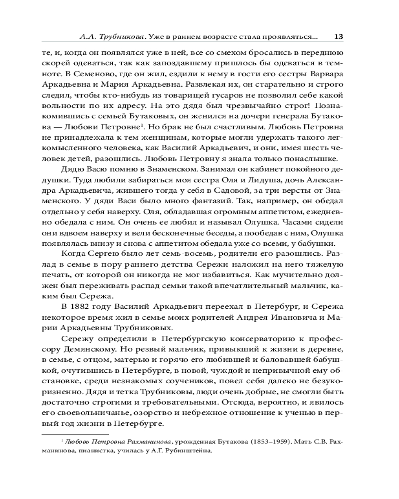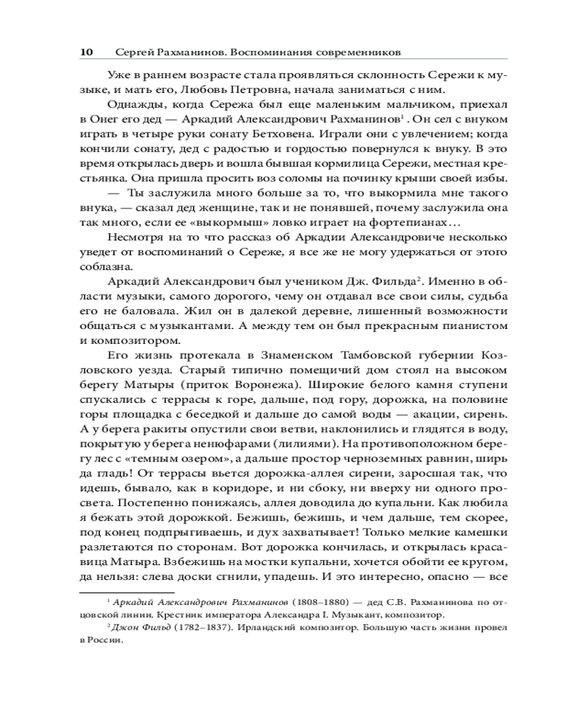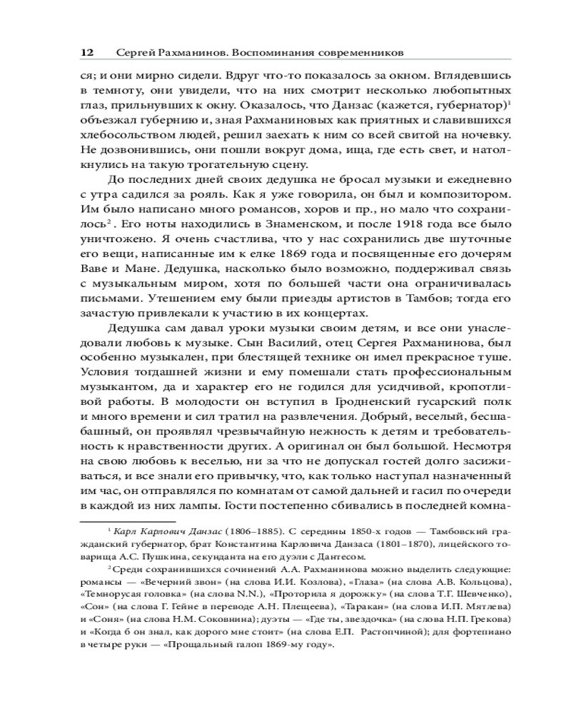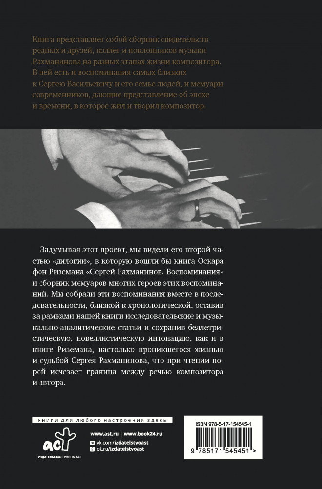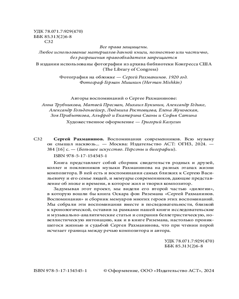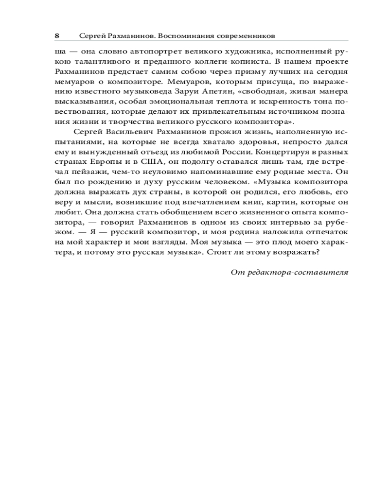 Серия: Большое искусство. Персоны и биографии Книга представляет собой сборник свидетельств родных и друзей, коллег и поклонников музыки Рахманинова на разных этапах жизни композитора. В ней есть и воспоминания самых близких к Сергею Васильевичу и его семье людей, и мемуары современников, дающие представление об эпохе и времени, в которое жил и творил композитор. |