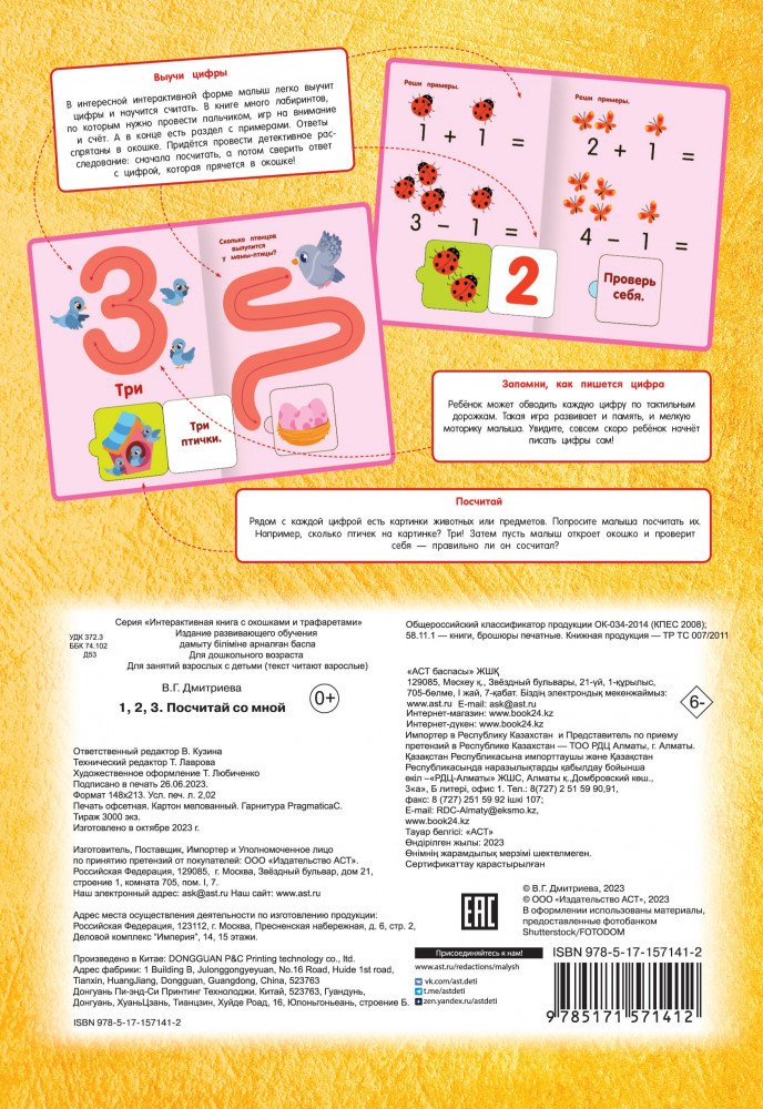 💳 Оплатить за товар можно при получении 🇰🇿 Есть бесплатная доставка по Казахстану от 1 дня 🎁 Копите бонусы с каждой покупки Серия: Интерактивная книга с окошками и трафаретами «1 2 3 Посчитай со мной» — это уникальная интерактивная книга, которая поможет малышу выучить цифры необычным способом! Ребёнок может провести пальчиком по трафарету и запомнить не только саму цифру, но и её форму. На страницах также есть окошки, которые помогут ребёнку научиться считать. Для детей дошкольного возраста. |