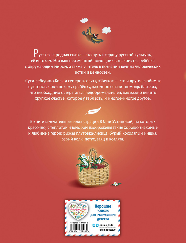 💳 Оплатить за товар можно при получении 🇰🇿 Есть бесплатная доставка по Казахстану от 1 дня 🎁 Копите бонусы с каждой покупки Серия: Золотые сказки для детей Русские сказки — это кладезь русской культуры, её истории и традиций. С помощью сказок можно узнать особенности быта русского народа, а также на примере животных обсудить с ребёнком много важных тем. Сказочные сюжеты с красочными иллюстрациями будут для детей увлекательным приключением, за которым интересно наблюдать. В сборник вошло 20 известных русских народных сказок: «Волк и семеро козлят», «Журавль и цапля», «Гуси-лебеди», «Морозко» и другие. В книге замечательные иллюстрации русской художницы Юлии Устиновой, которые встречаются на каждой странице. |